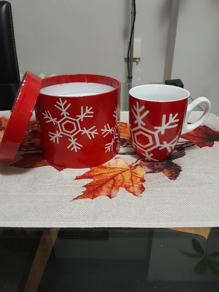 Selling a new Snowflake print mug ( red and white) that comes with its original box! The mug is made of 100% porcelain and is both dishwasher and microwave safe. Perfect for enjoying your favourite hot beverages this winter season. Can be a gift.