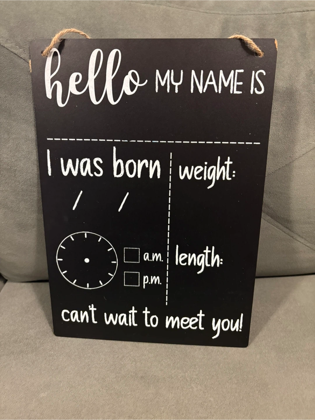 I'm selling a brand new baby chalkboard sign. It's perfect for announcing your baby's birth details like date, weight, and length. 'Hello My Name Is' is printed on the top of the sign. It also has a cute clock design and space to write 'can't wait to meet you!'