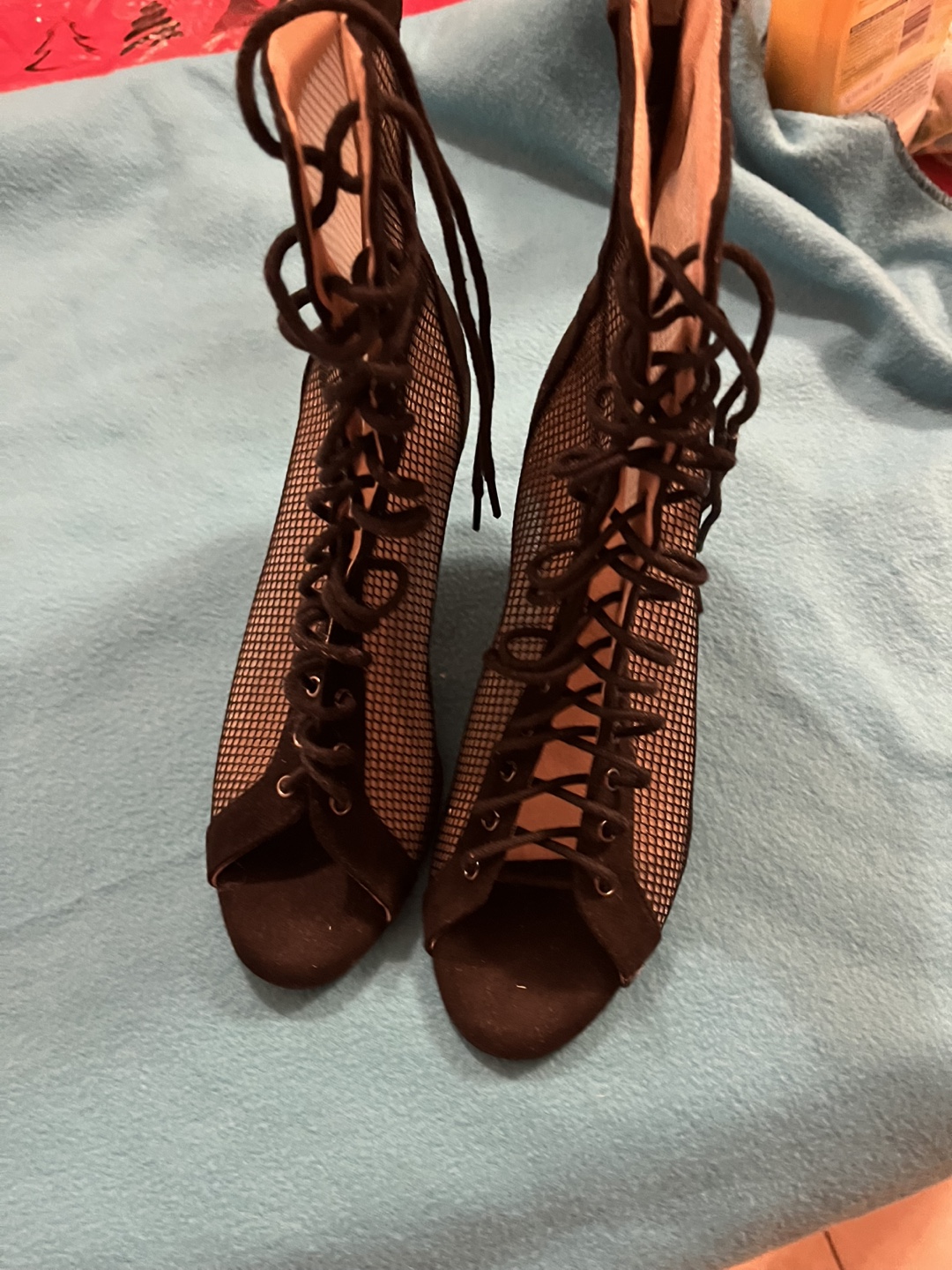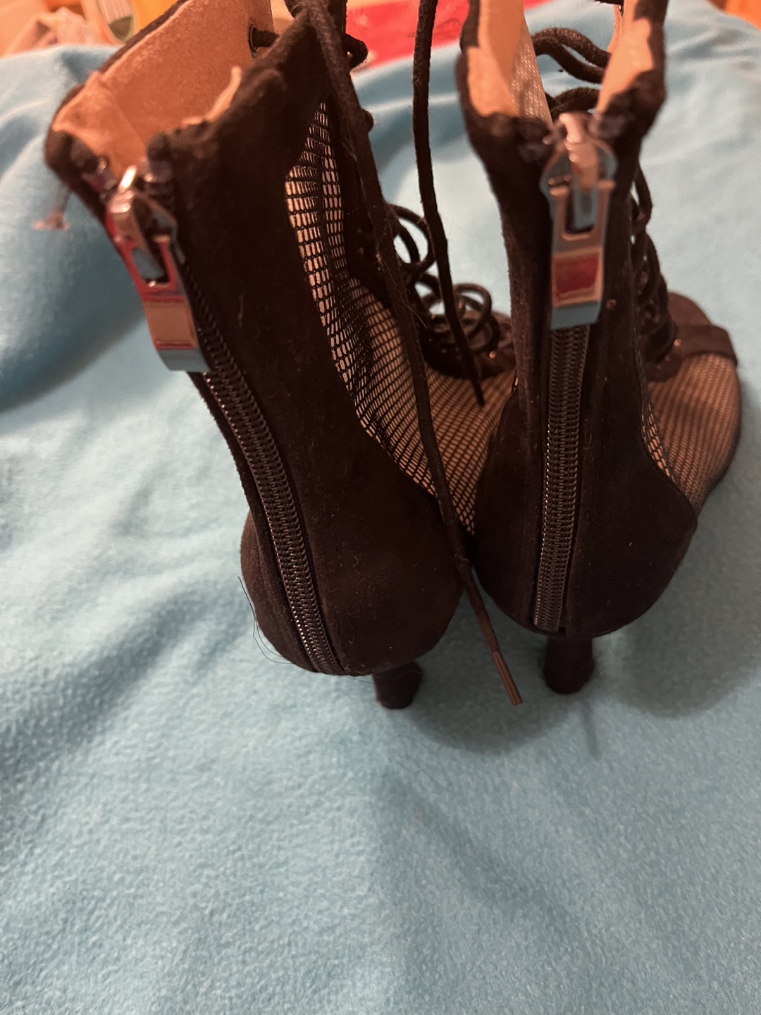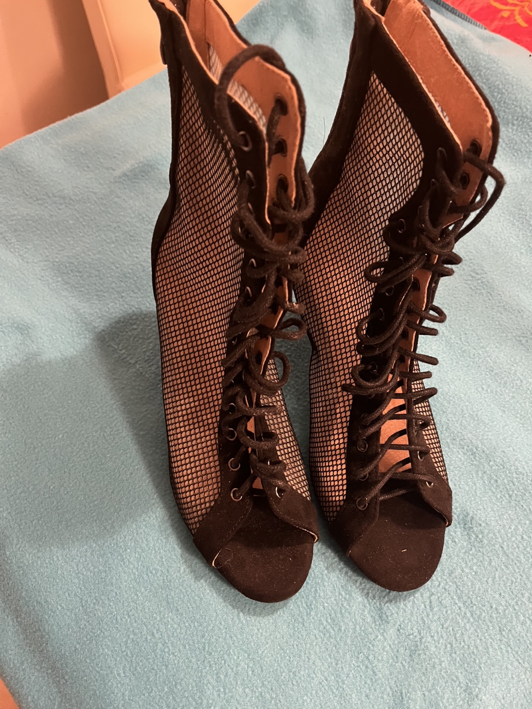 A pair of black lace-up heel booties! They have a unique mesh design and a comfortable heel height. Perfect for a night out or a special occasion. They are in great condition, brand new.
