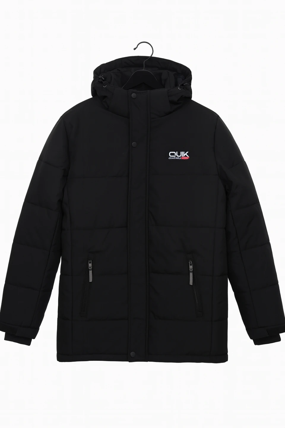 This is a Quik men's puffer jacket in black. It's perfect for staying warm during the colder months. It has a hood and a zipper. It's in great condition!