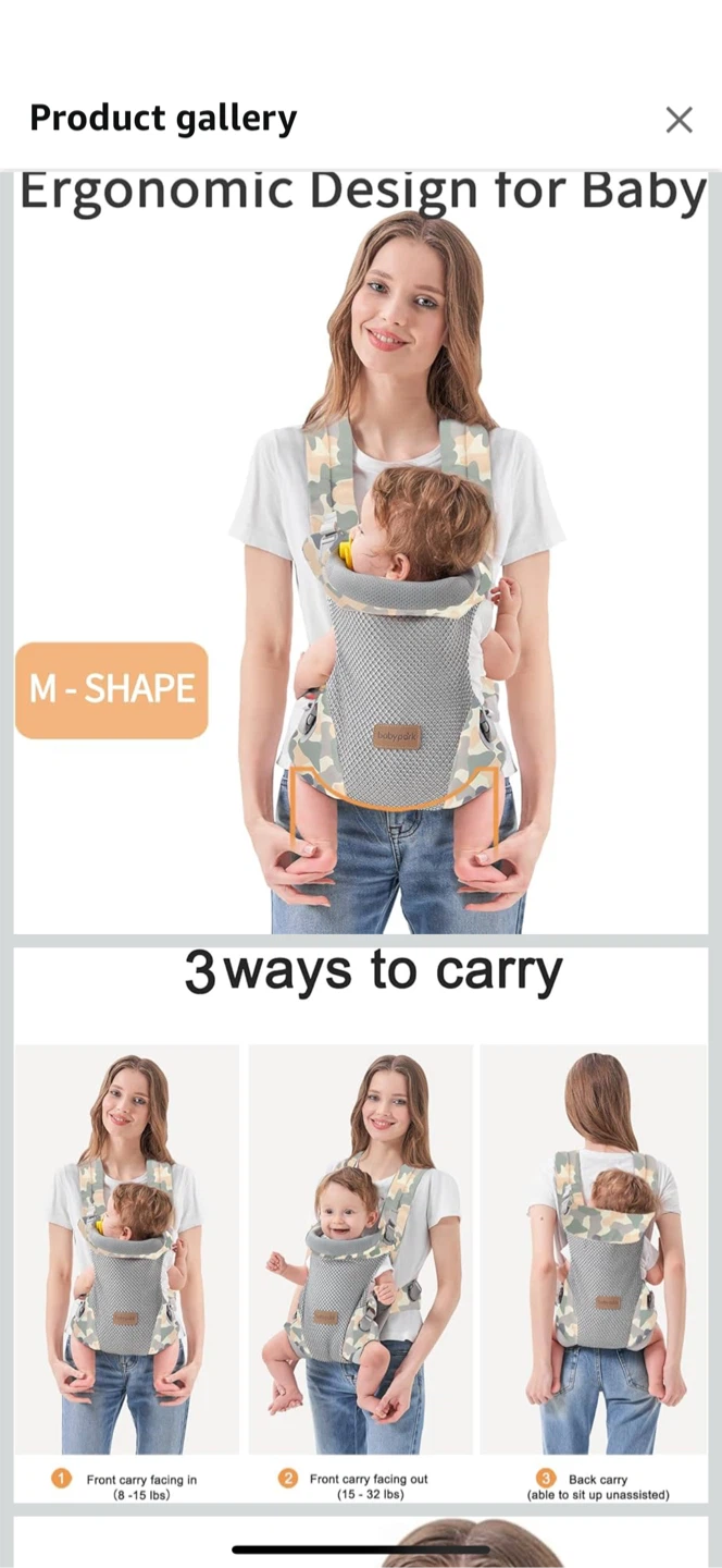 - 3 ways to carry: front carry facing in (8-15 lbs), front carry facing out (15-32 lbs), and back carry (able to sit up unassisted)