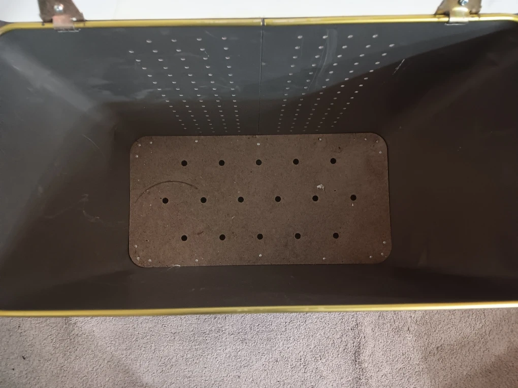 This is a cool vintage storage trunk that could also be used as an ottoman. It has a unique geometric pattern in shades of blue, pink, and purple. The interior is spacious and in good condition. Perfect for adding a pop of retro style to your home!