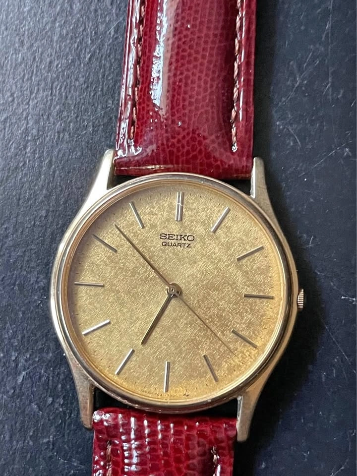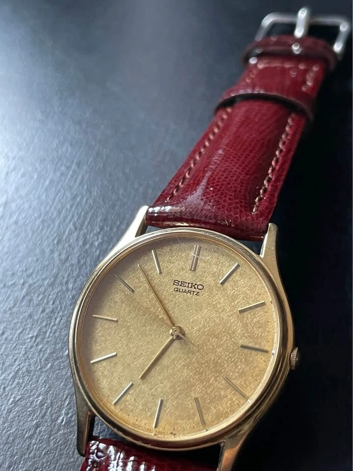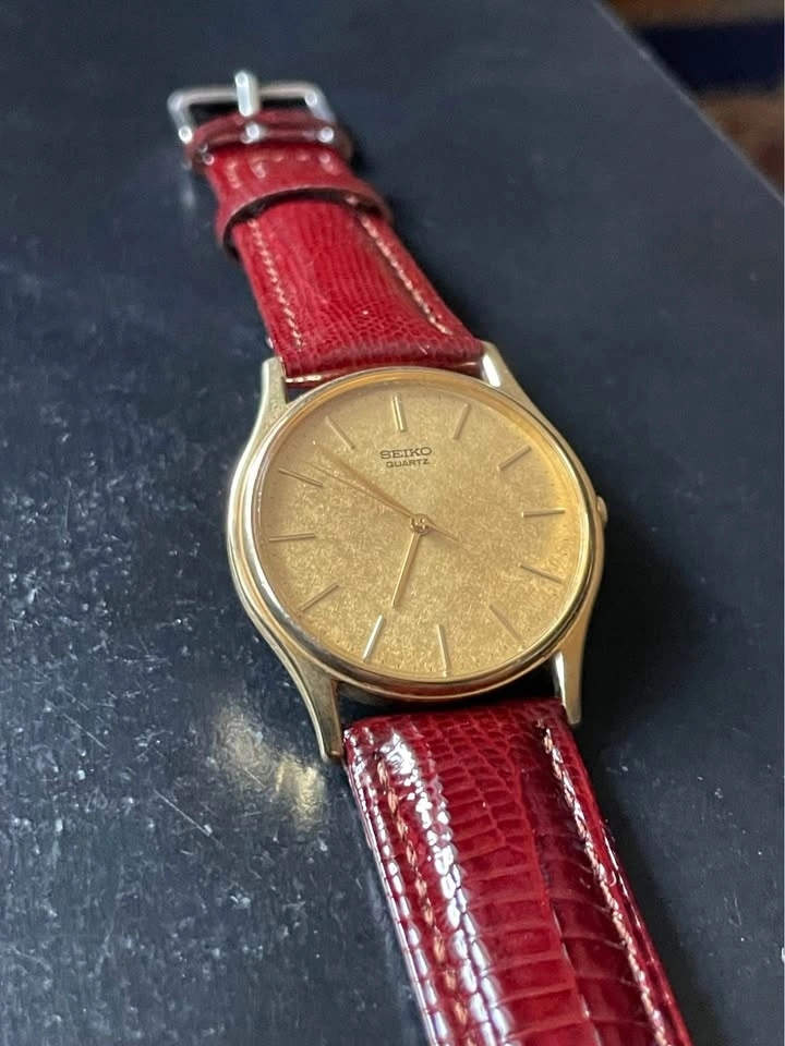 Men’s Seiko Quartz Gold Dial Watch with Brand New Leather Band and Brand New Battery. Near mint condition, clean face, and clear crystal. Stylish, vintage look with Japanese movement.