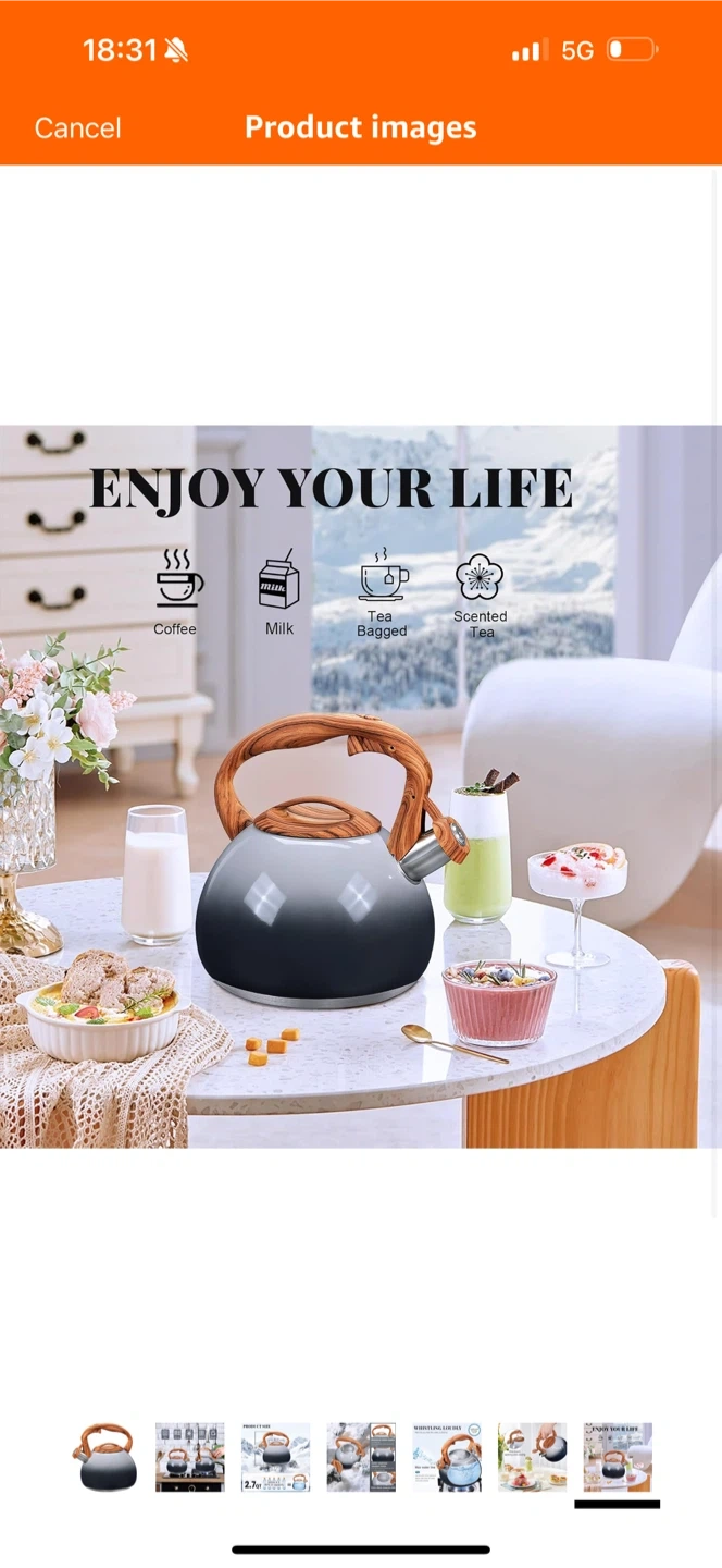 This kettle features an ergonomic design handle for a comfortable grip and a wooden appearance. It has a smoky charcoal gradient finish and is made of food grade stainless steel, so it's not easy to rust and is easy to clean. It whistles loudly to remind you that the water is boiling. The product size is 8.8" x 7.7" x 4.1" and the capacity is 2.7QT