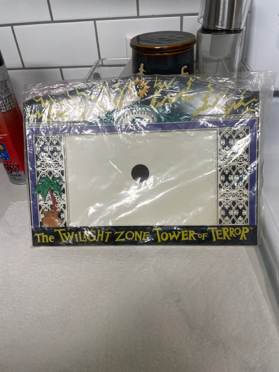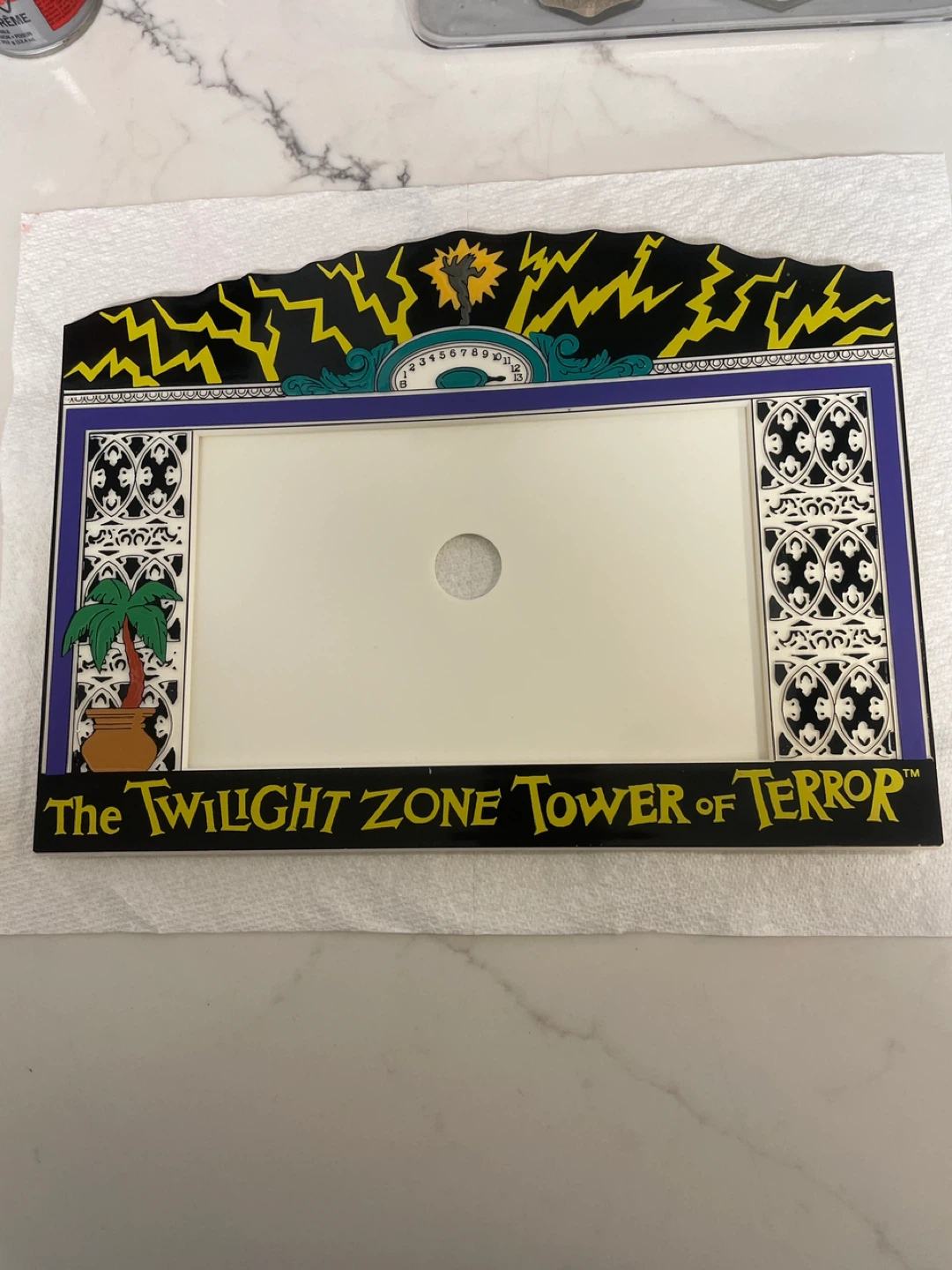 The item pictured is a vintage souvenir picture frame from the Disney theme park attraction, "The Twilight Zone Tower of Terror".