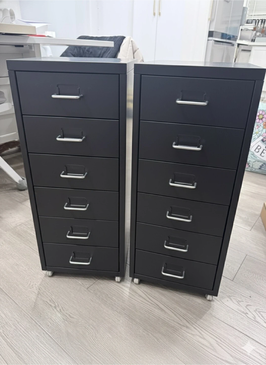 Selling two IKEA HELMER drawer units on casters in black. They're in great shape and perfect for adding some storage to any room. They're super handy and easy to move around!
