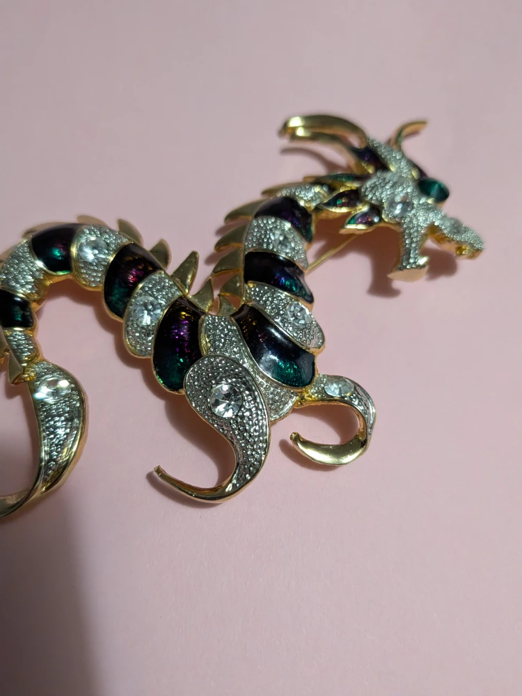 Large vintage dragon brooch up for grabs! Gold-tone with sparkly rhinestones and have a cool vintage look. Perfect for adding a bit of flair to your jacket or bag