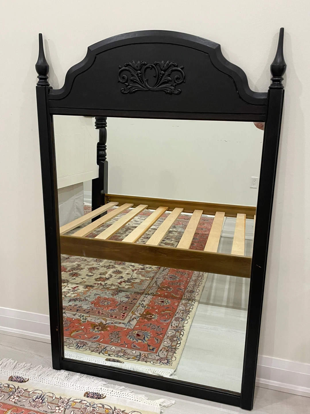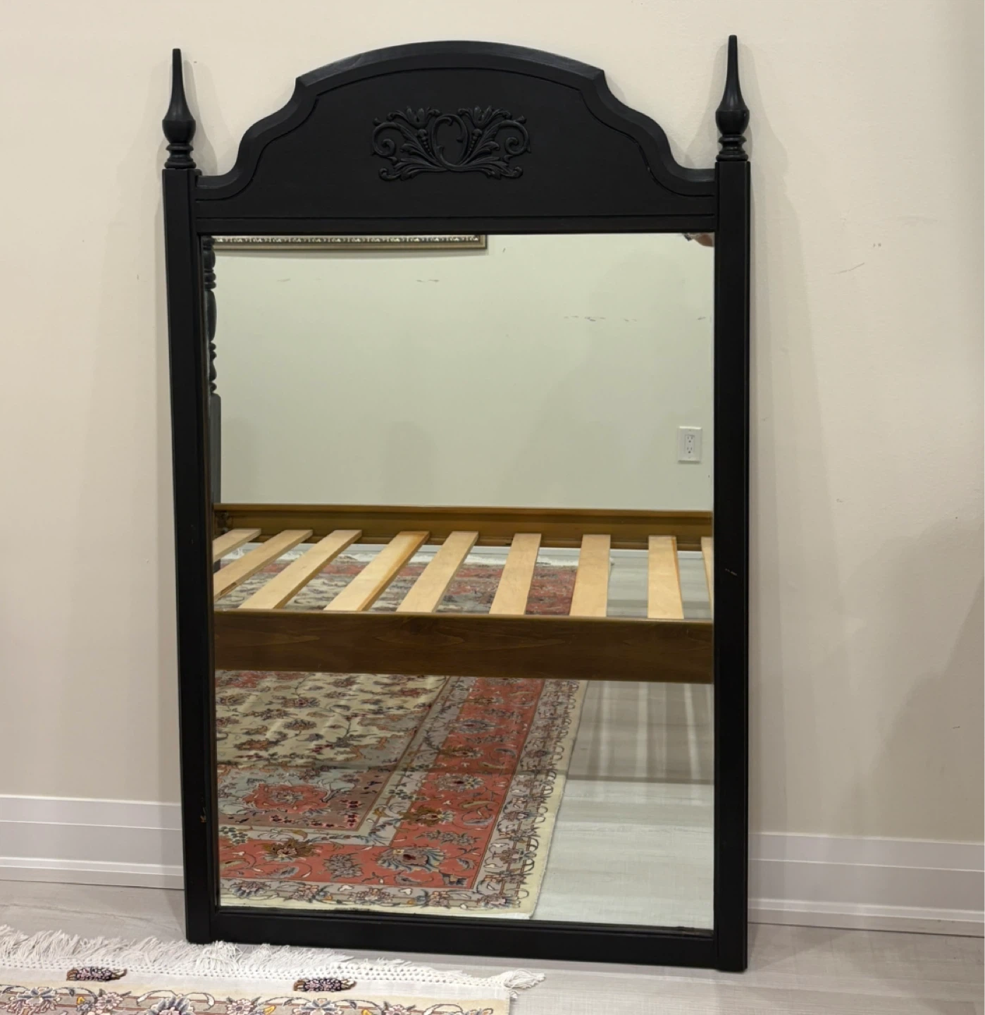 Beautiful decorative mirror with a solid black frame and an intricate carved top. The arched design adds charm and character to any room — perfect above a dresser, console table, or in an entryway.