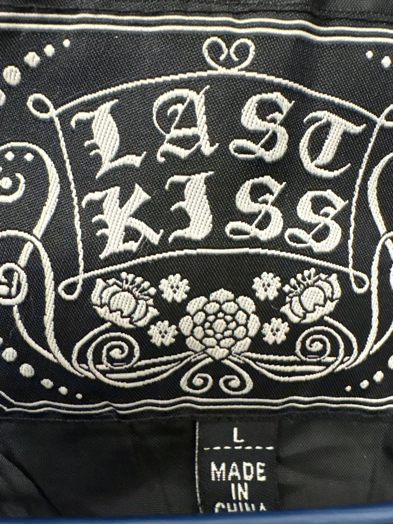 Selling a Last Kiss coat in a black and white herringbone pattern. It's a size large and features a tie waist and ruffled collar. Perfect for adding a bit of flair to your wardrobe!