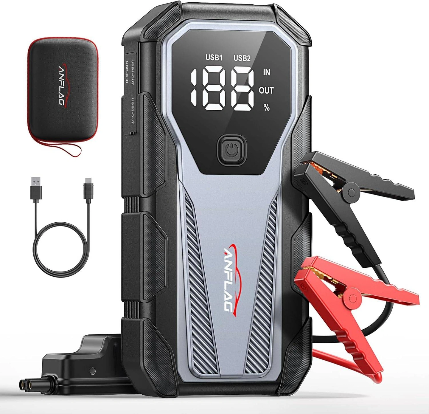 Check out this versatile power bank from ANFLAG! It has a 16800mAh capacity, perfect for camping trips or emergencies. It features two output ports (one with fast charge) and an input port. The digital display shows the battery percentage. It also comes with a carrying case, USB-C cable, and jumper cables