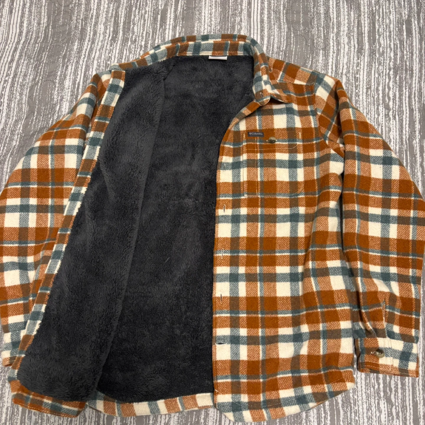 Cozy Columbia flannel shirt jacket in size small but can also fit a size medium. It has a soft, warm lining, perfect for chilly days!