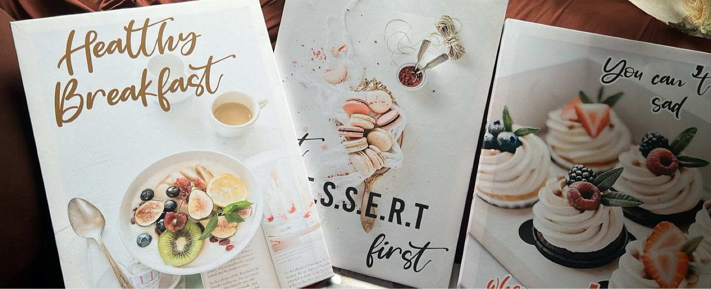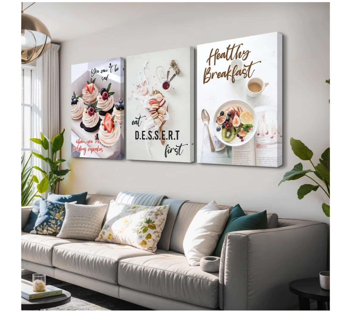Set of three canvas prints featuring dessert and breakfast themes. Each measures 30L x 40W cm. These prints are called Artwork13 and would look great in a kitchen or dining room!