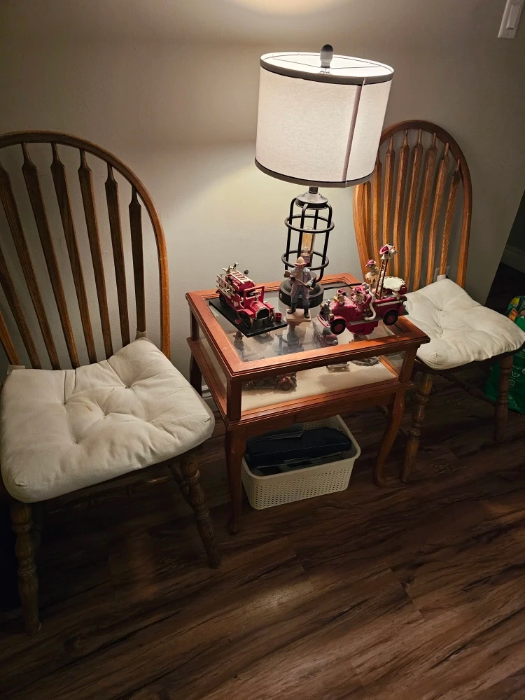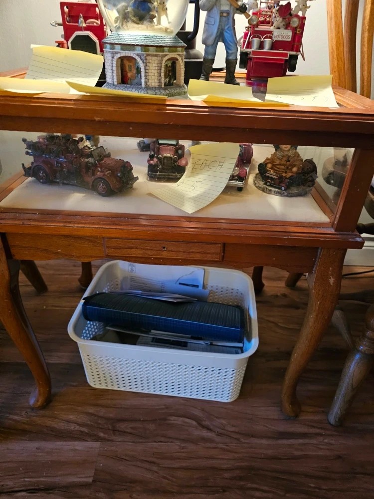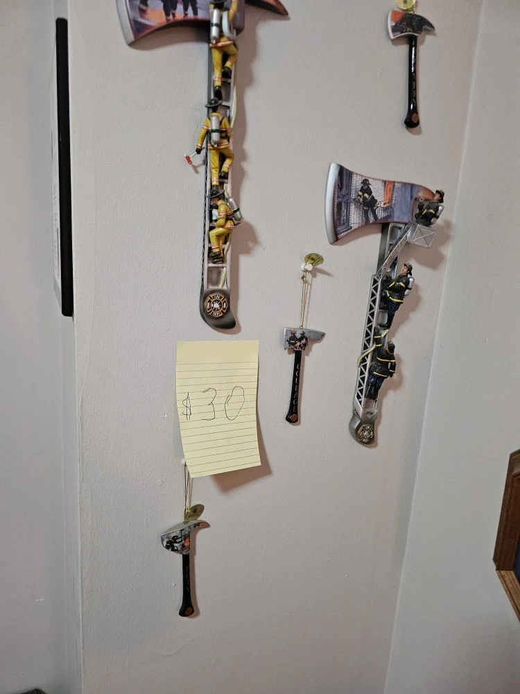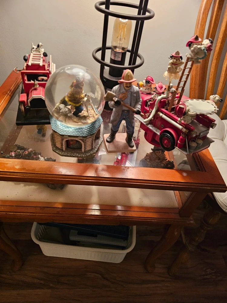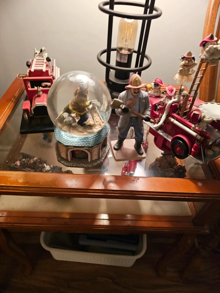 Selling a collection of firefighter-themed figurines and decor. Includes a snow globe, firefighter figurines, decorative axes, and framed art. Great for collectors or anyone who loves firefighting memorabilia!