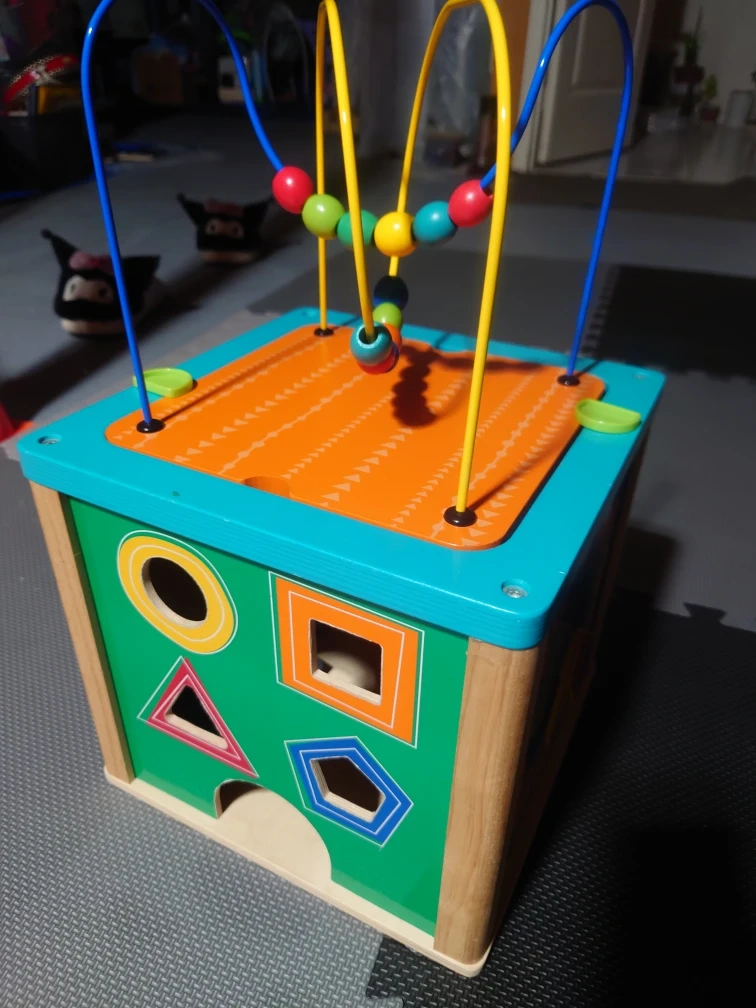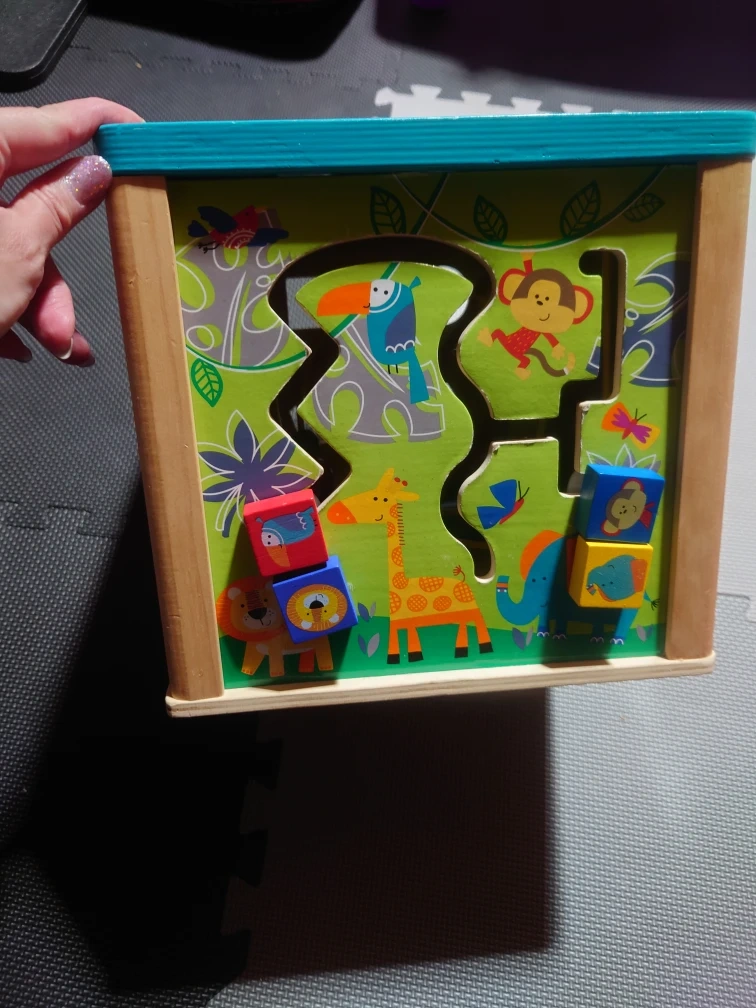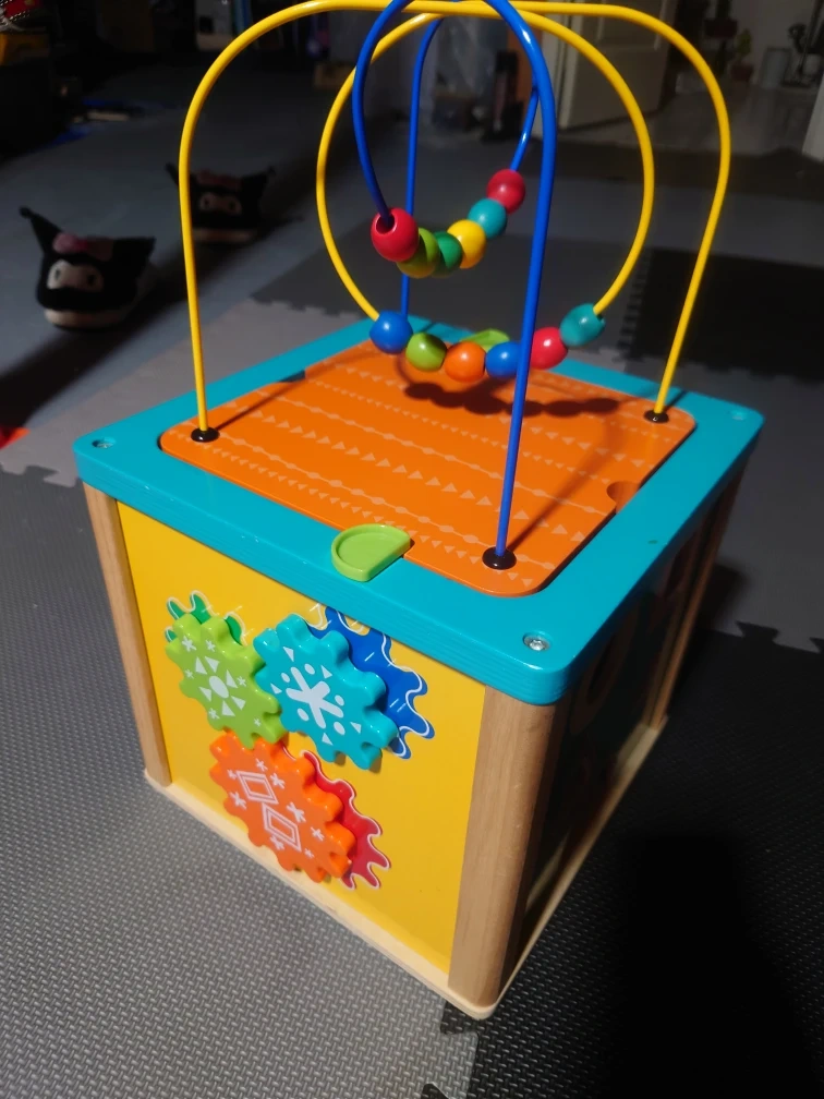 This wooden activity cube is perfect for keeping little ones entertained! It features lots of different activities on each side, including a bead maze, shape sorter, and animal puzzles. It's in great condition and ready for a new friend to play with