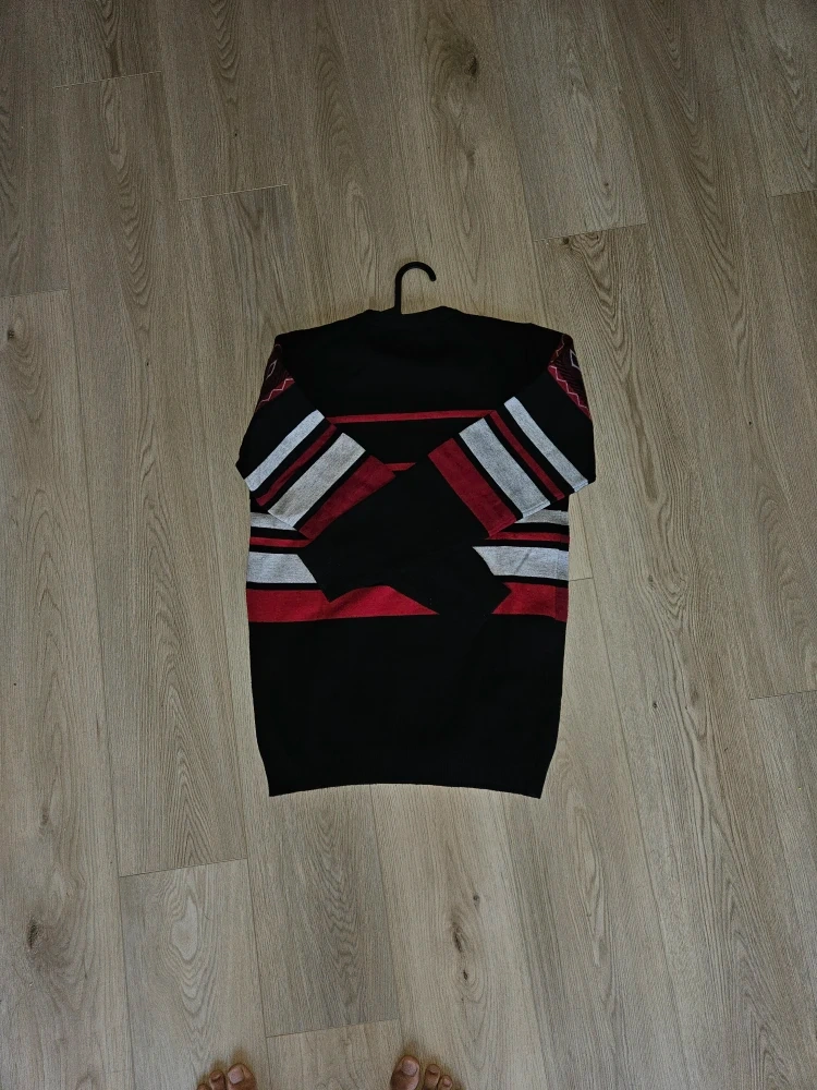 Selling a sweater with a striped pattern in black, red, and grey. It's in great condition and ready for a new owner!