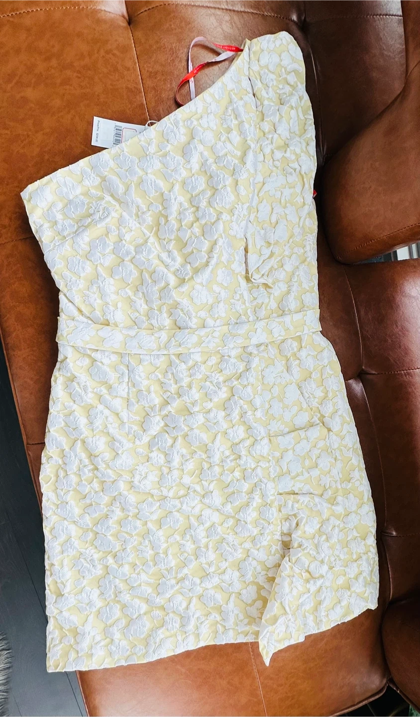Selling a ML Monique Lhuillier Ruffle Jacquard One-Shoulder Mini Dress in the colour Straw! It's in great condition and ready for a new home. This dress is perfect for a special occasion or a night out.