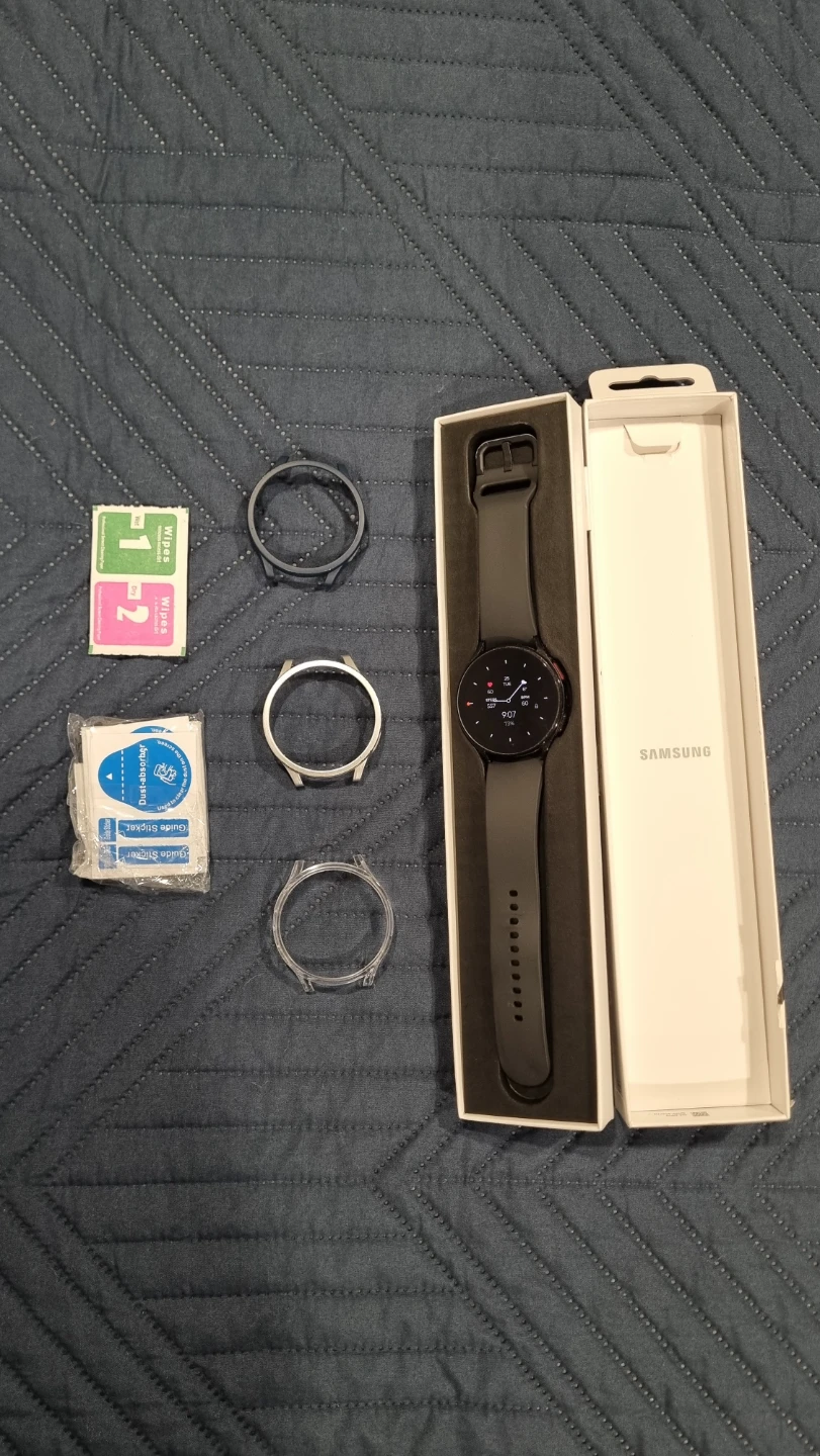 Selling a Samsung Galaxy Watch 5 44 mm in black. It comes with the original box and some extra screen protectors and watch bands. Great condition!