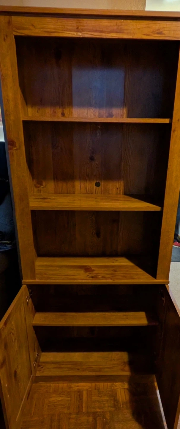Here's a nice wooden bookcase with some storage space at the bottom. It has a warm, inviting look and would be great for displaying your favourite books or storing household items.