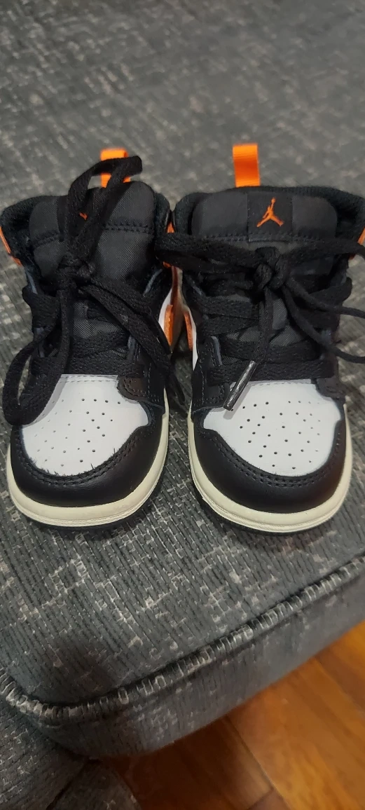 Selling a pair of Nike Air Jordan 1 toddler shoes in size 5.5 c They new condition and ready for a new little one to wear! The shoes feature the classic Air Jordan design with orange, white, and black colors.