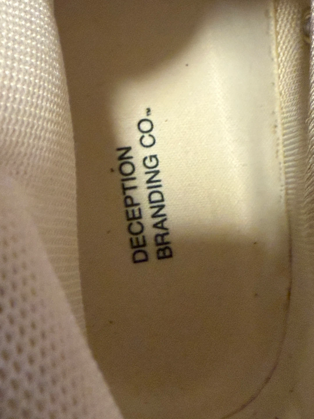 Selling a pair of Deception Co. high top sneakers in US men's size 9.5. They feature a colorful and unique design. The upper is made of synthetic fiber and leather, the lining is synthetic fiber, and the outsole is rubber.