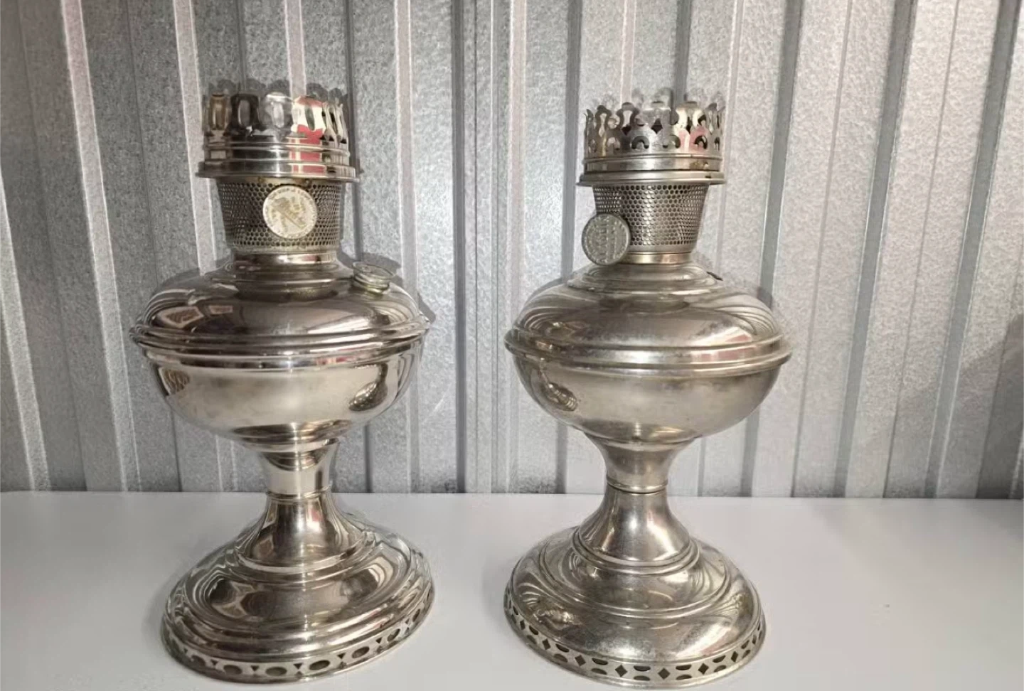 Here are two vintage silver oil lamps! They would make a great addition to any room or collection. They have a unique design and are in good condition.
