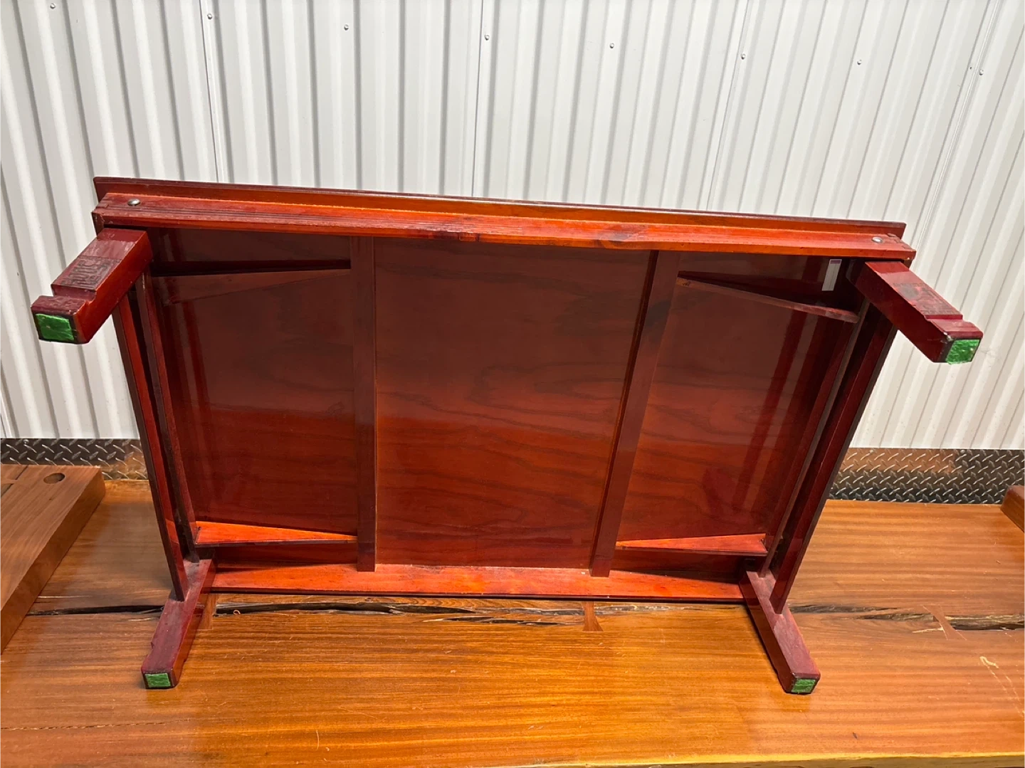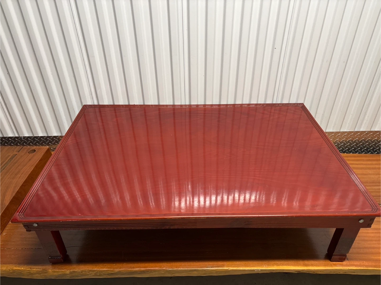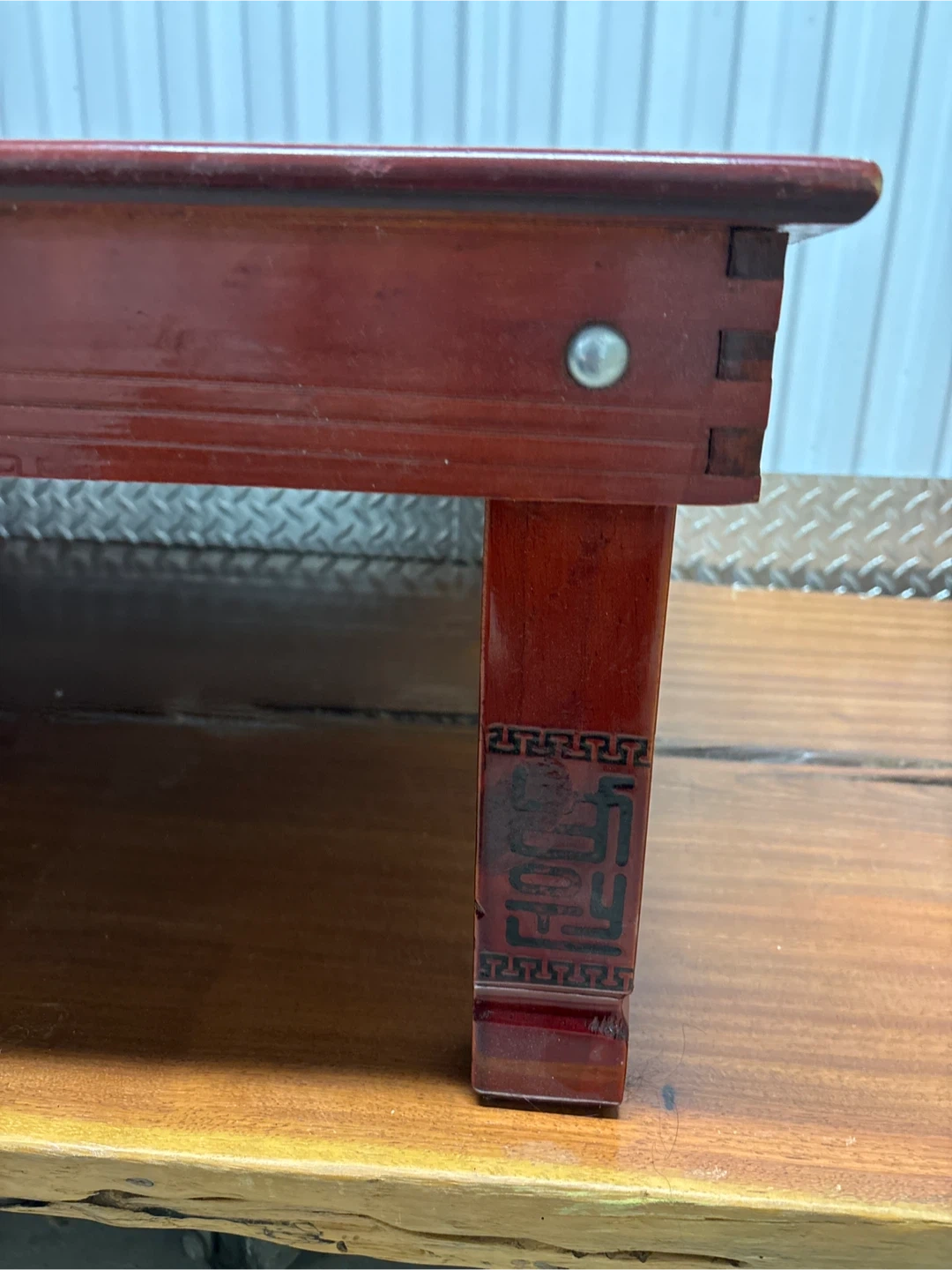 Selling a red lacquered low folding table. It's in good condition and perfect for small spaces. The table features a unique design on the legs. It is a beautiful piece of furniture for any home!