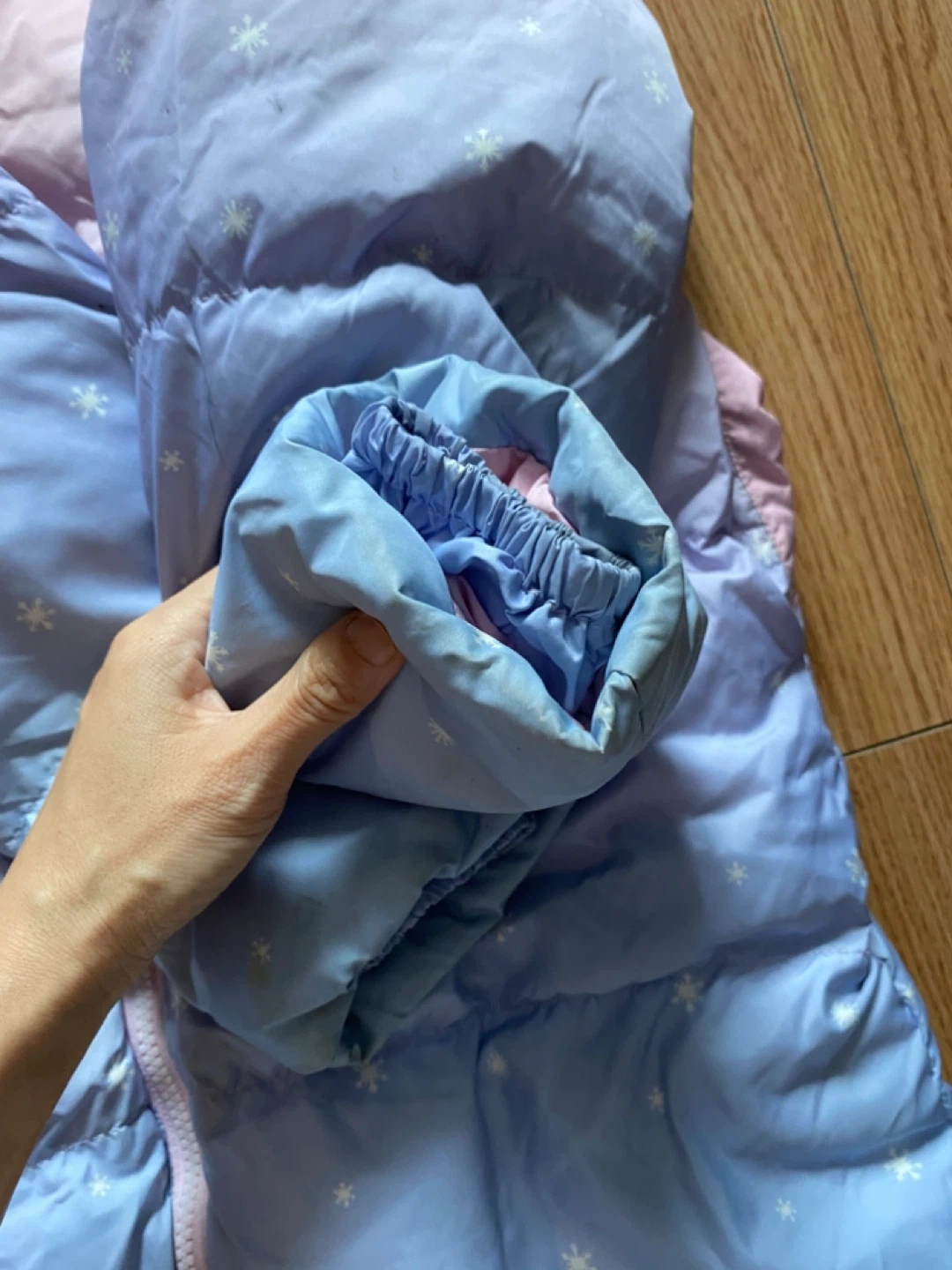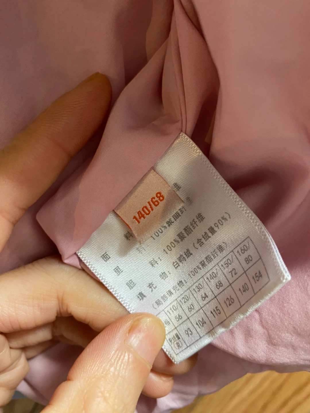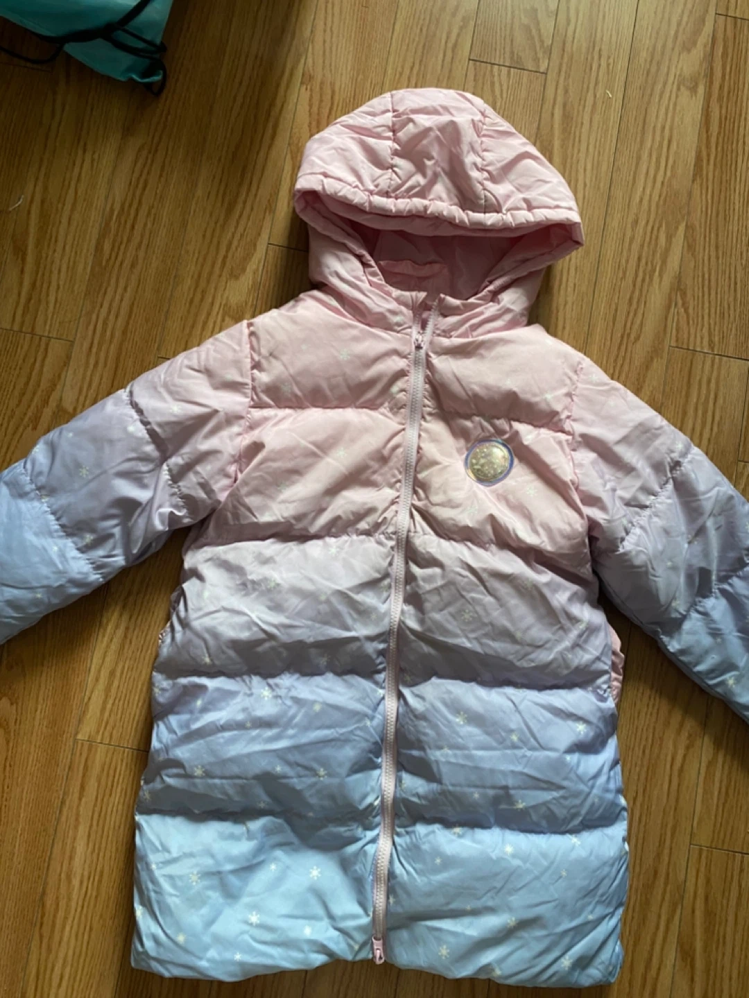 This is a girl's winter down padded jacket in a lovely gradient of pink and blue. It's size 145. perfect for keeping your little one warm and cozy during the cooler months! The jacket features a hood and a zipper closure.
