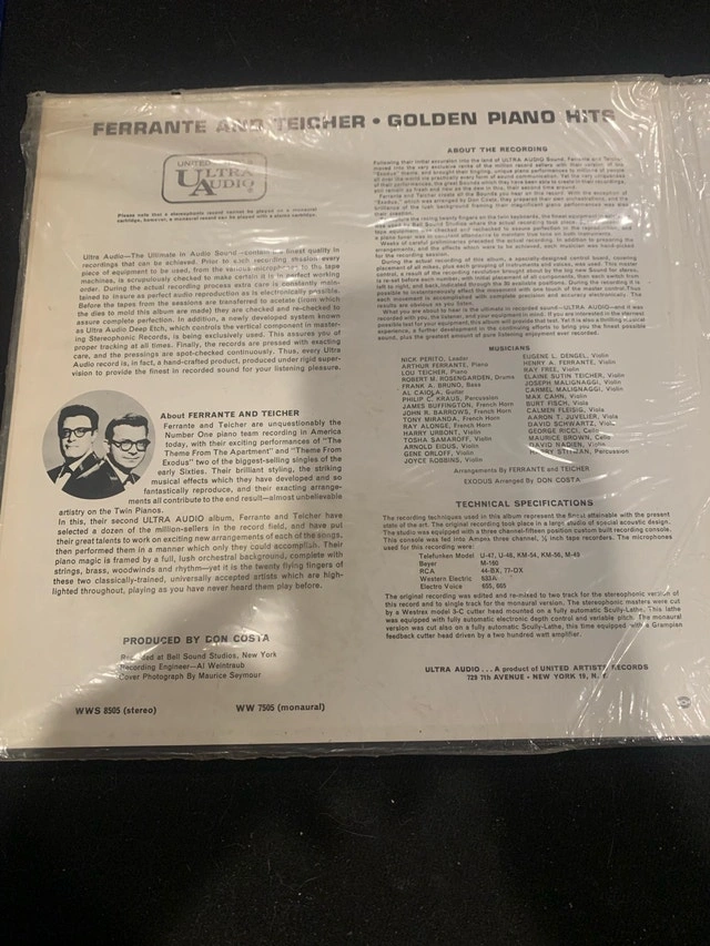 Relive the golden age of piano with this Ferrante and Teicher Golden Piano Hits LP. Though previously enjoyed, this record is in good condition, ready to fill your home with classic melodies. Additional details include: * Artists: Ferrante & Teicher * Title: Golden Piano Hits * Conductor: Nick Perito * Sound: Wall to Wall Sound This LP offers a nostalgic journey through timeless tunes. If you're seeing this ad, yes, it’s still available, ready to find a new home and spin some joy!