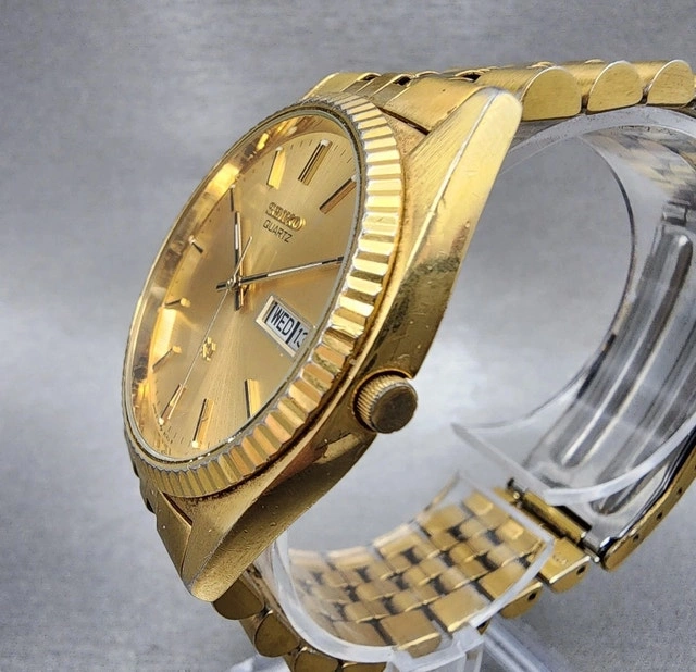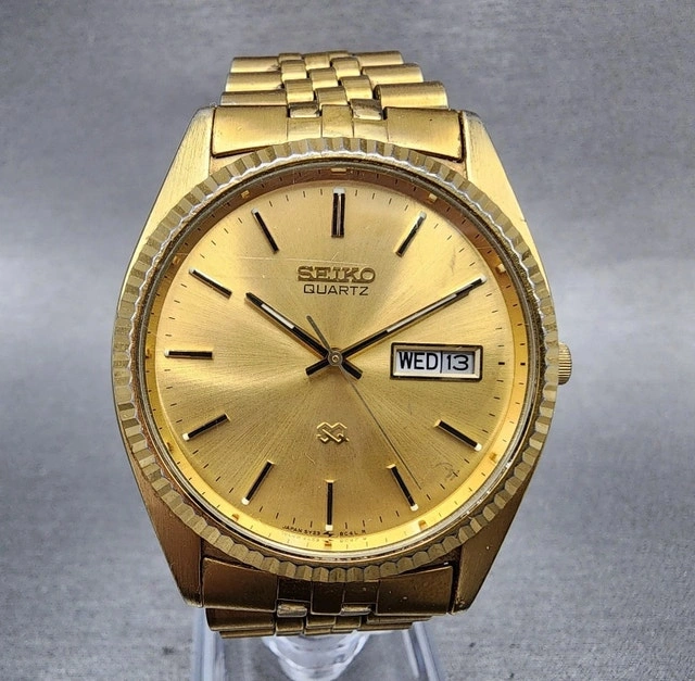 This Seiko men's watch (price reduced as it needs a battery) - features a stunning solid gold gilded finish and is in great shape for its vintage. It tells the day and date! It's a classy timepiece ready for a new owner. If the ad is up, it's still available! Happy hunting!
