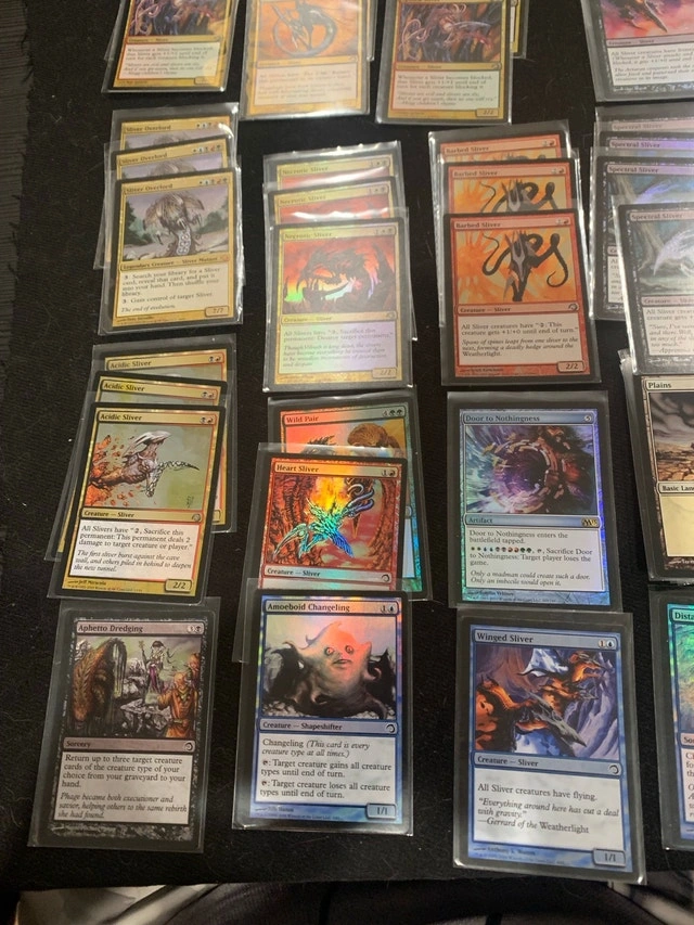 Dive into a treasure trove of Magic: The Gathering history with this massive collection of Super Slivers! These cards have seen some action, making them used but still ready to dominate your next game night. Perfect for collectors and players alike. Ask yourself how did he get 4 of each SLIVER? I bought FOUR SETS! And I’m not kitten. ⬛ The value comes from eBay closed sales and Karrot. If the ad is still up, these Sliver cards are available!