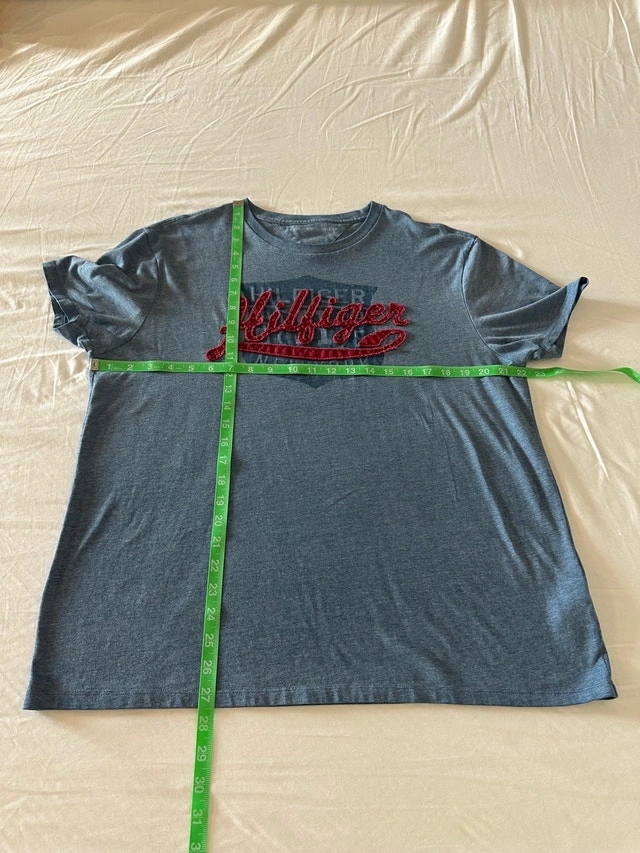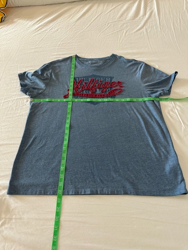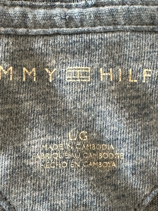 Check out this vintage Tommy Hilfiger t-shirt in a men's large size, featuring a unique embroidered logo. This shirt is made from a comfortable 60% cotton and 40% polyester blend, perfect for casual wear. Although it is a used item, it’s still in good condition and ready for a new home. Embrace the retro style with this classic tee! Here are some measurements: - Sleeve Length: 8.5 inches - Pit to pit: 22 inches - Shirt Length: 32 inches I'm pricing this at $35. If the ad is up, it's still available!