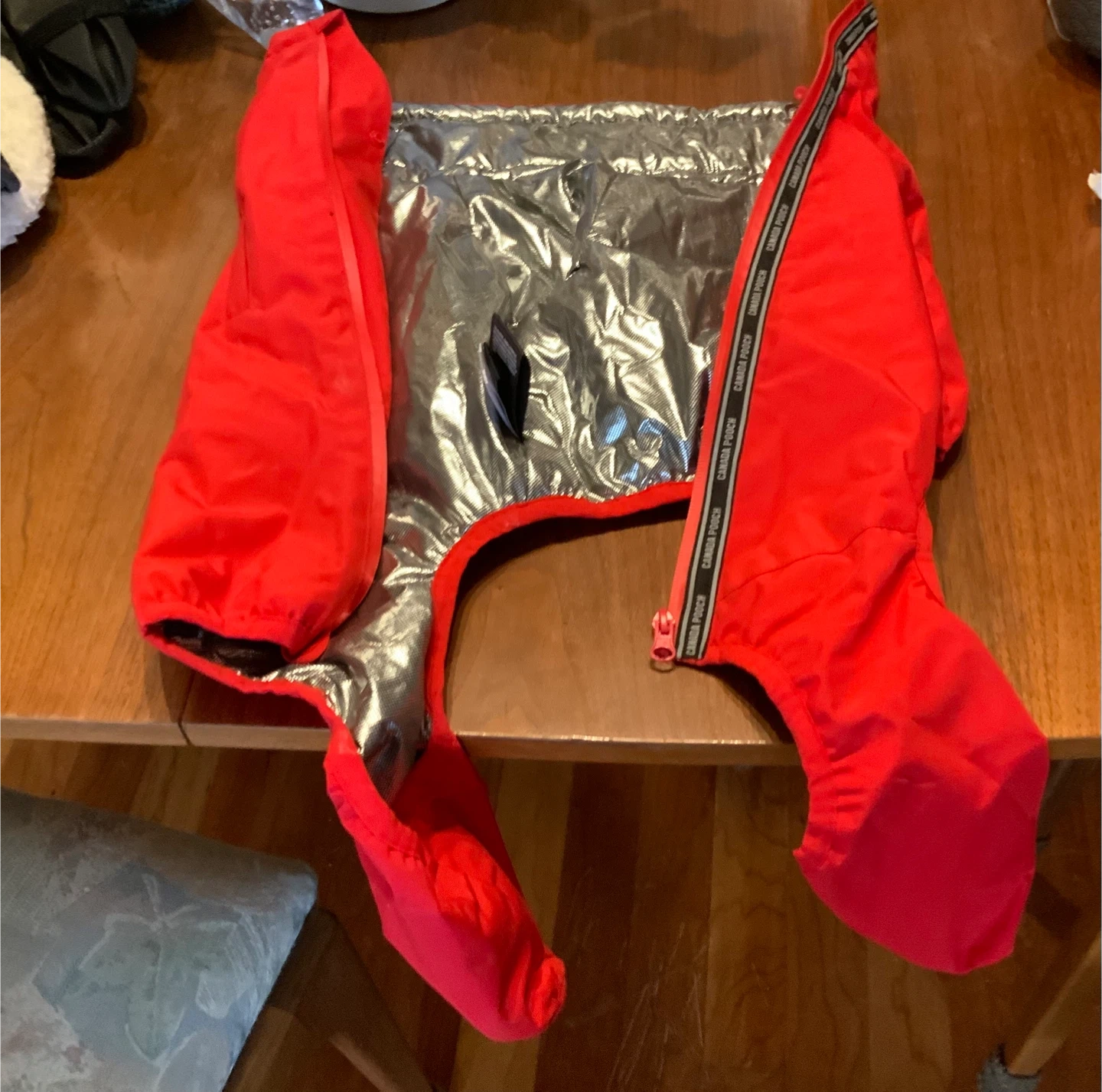 Warm red dog winter jacket from Canada Pooch. Features a zippered front for easy on and off. The outer shell is made of water-resistant material. This jacket is perfect for keeping your furry friend cozy during colder weather!