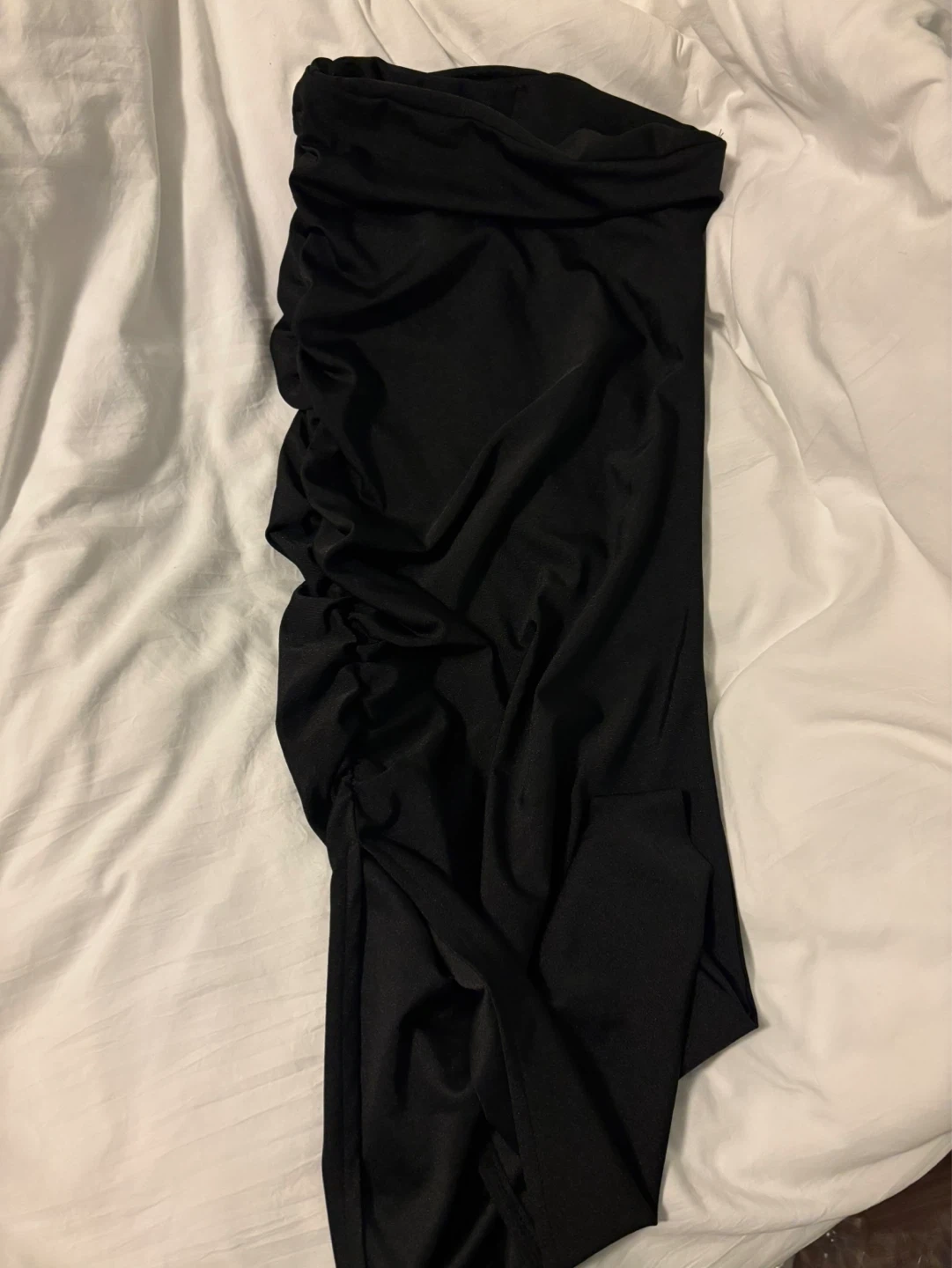 A black ruched midi skirt with an asymmetrical hem and a thigh-high slit. It's made of a stretchy fabric for a comfortable fit. This skirt would be a stylish addition to any outfit!