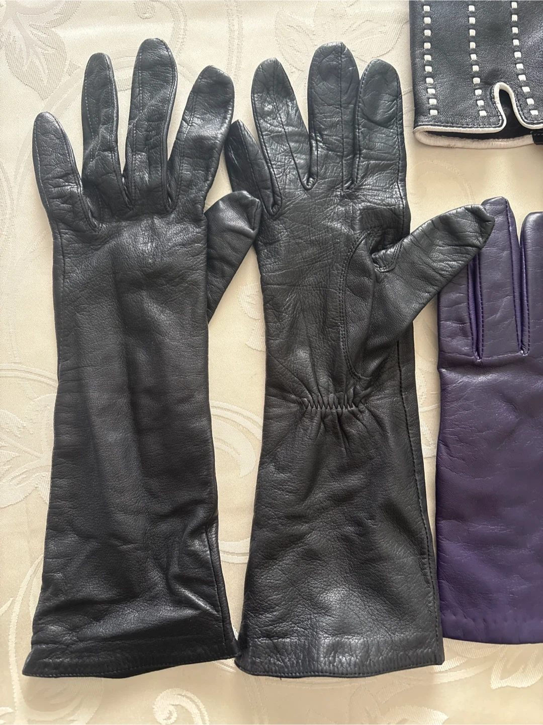 Collection of 3 pairs of leather gloves. Includes long black pair, one black pair with white stitching, and one pair of purple gloves. leather material.