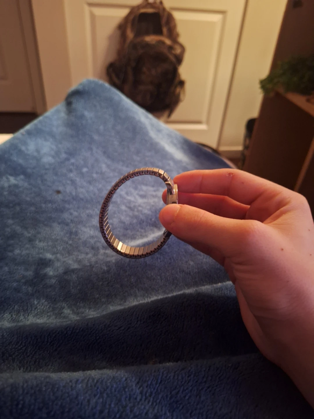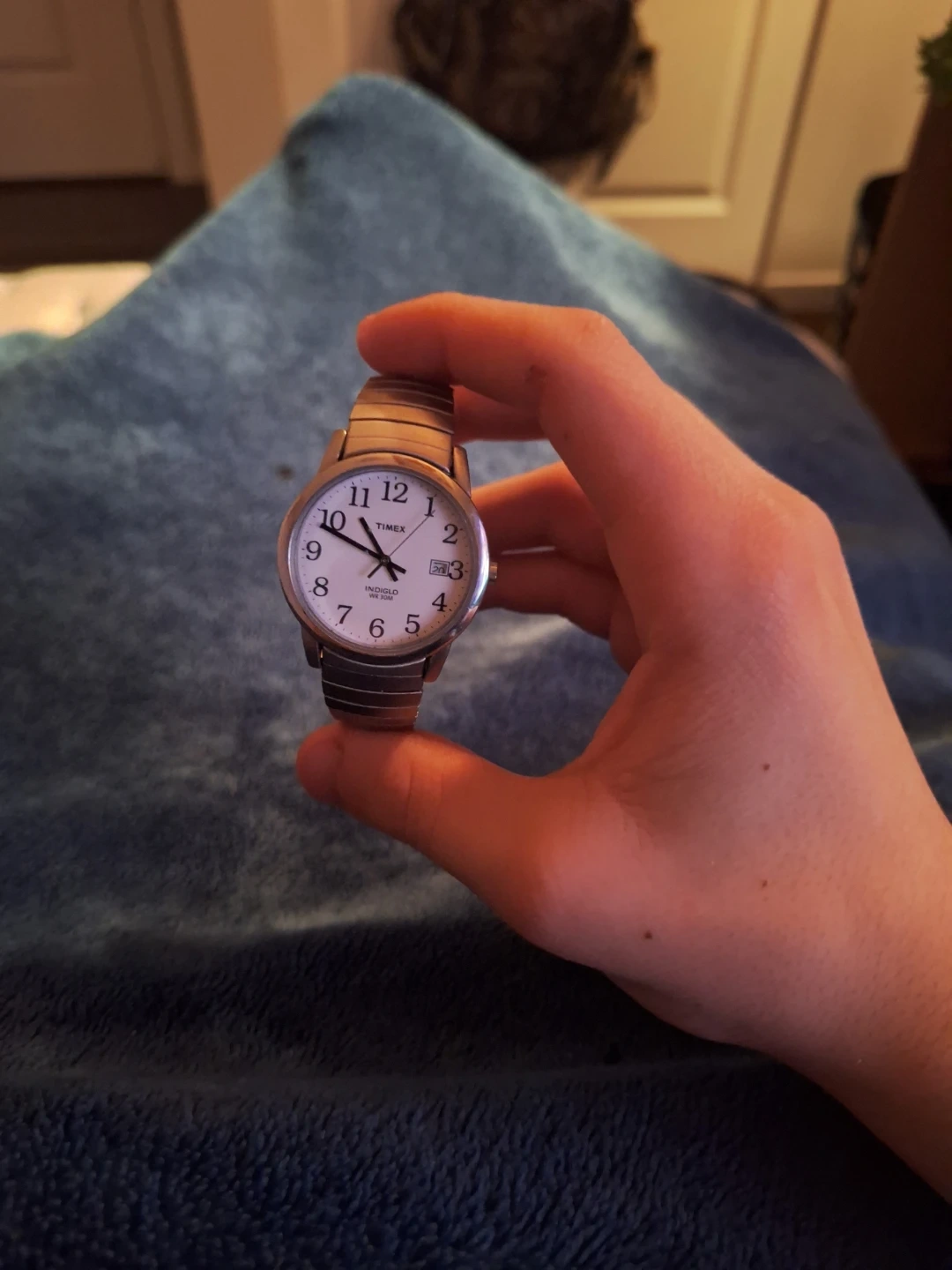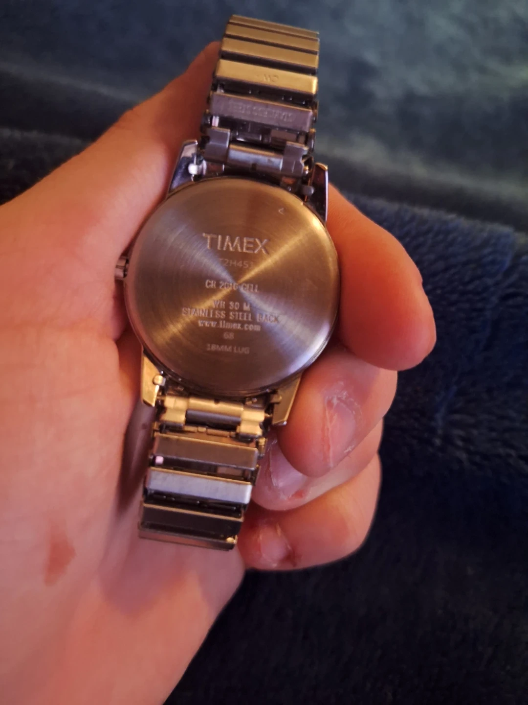 This is a Timex analog watch with a metal expansion band. It features a white dial and a date window. Water resistant WR 30 M. Stainless steel back.