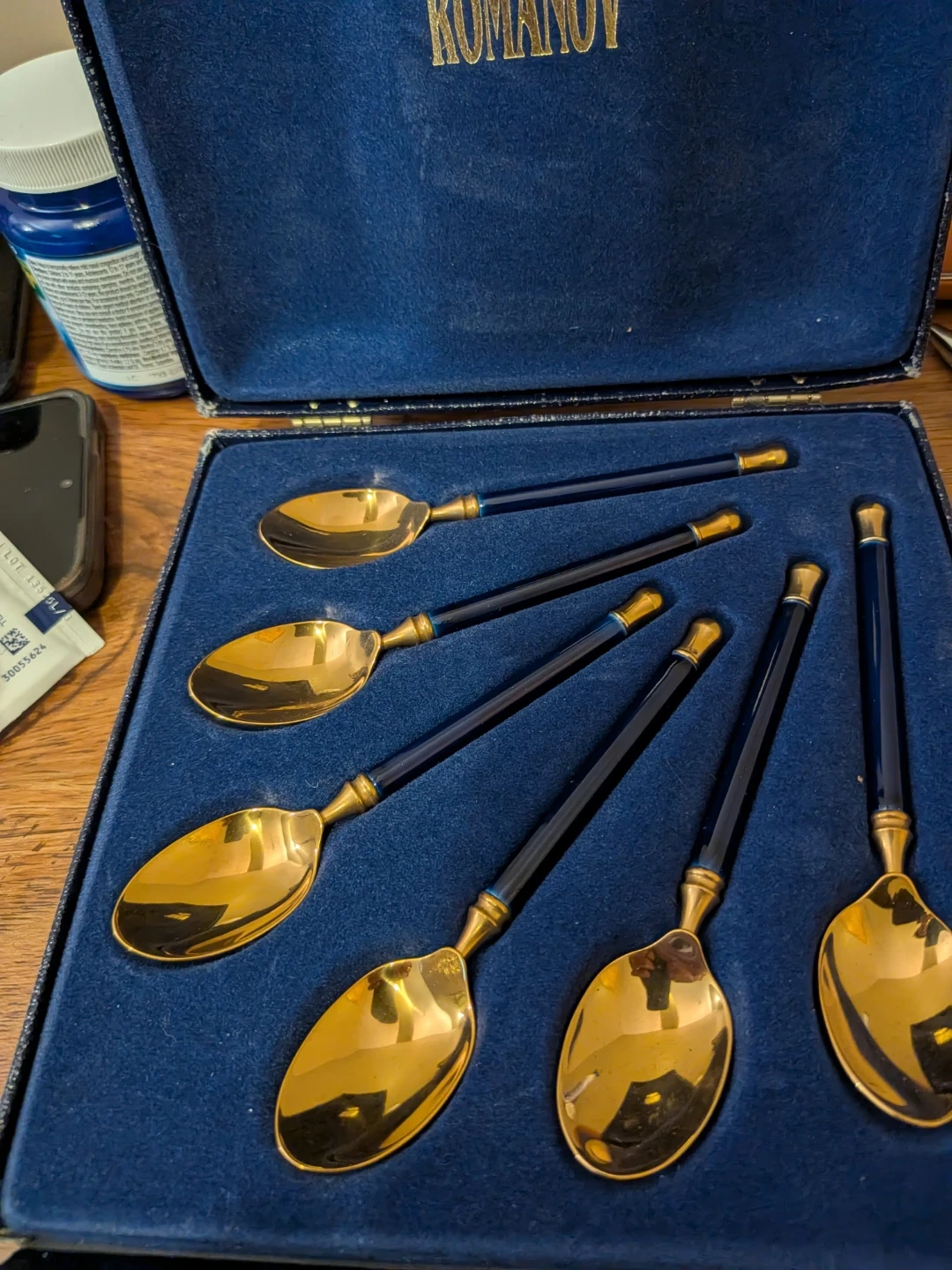 This is a set of five Romanov spoons. Each spoon has a gold-tone bowl and a dark blue handle with gold accents. They come in a blue velvet-lined case. These spoons would be lovely for serving dessert.