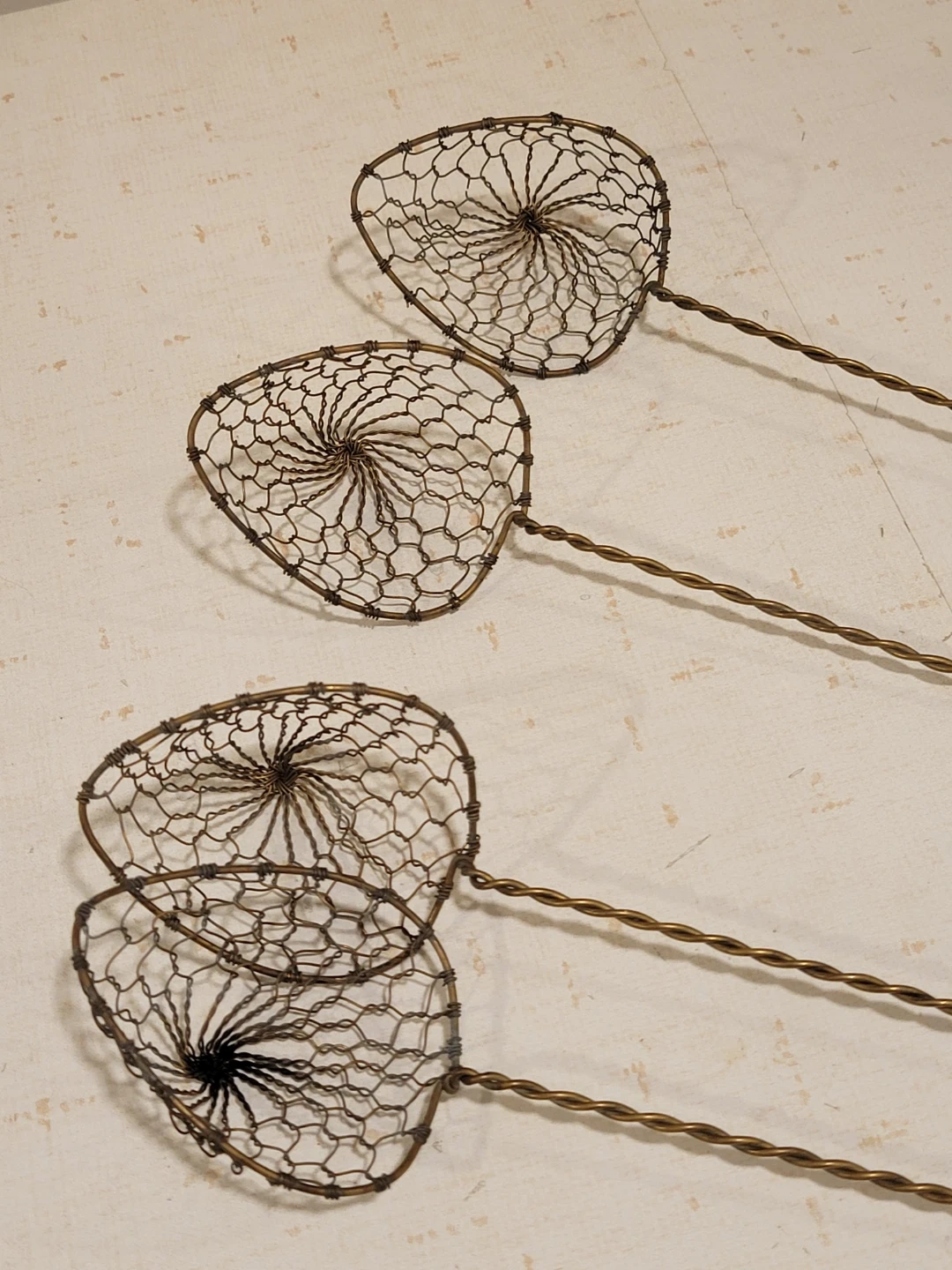 These items are set of four vintage-style wire mesh skimmers or strainers, often used for fondue, hot pot, or skimming fried foods.