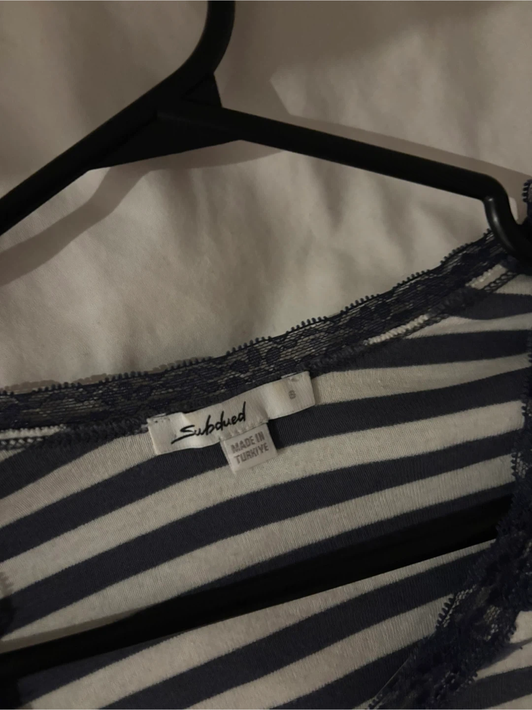 This is a long-sleeved top from Subdued with a grey and white stripe pattern. It features a v-neckline with delicate lace trim along the edge. Made in Türkiye.