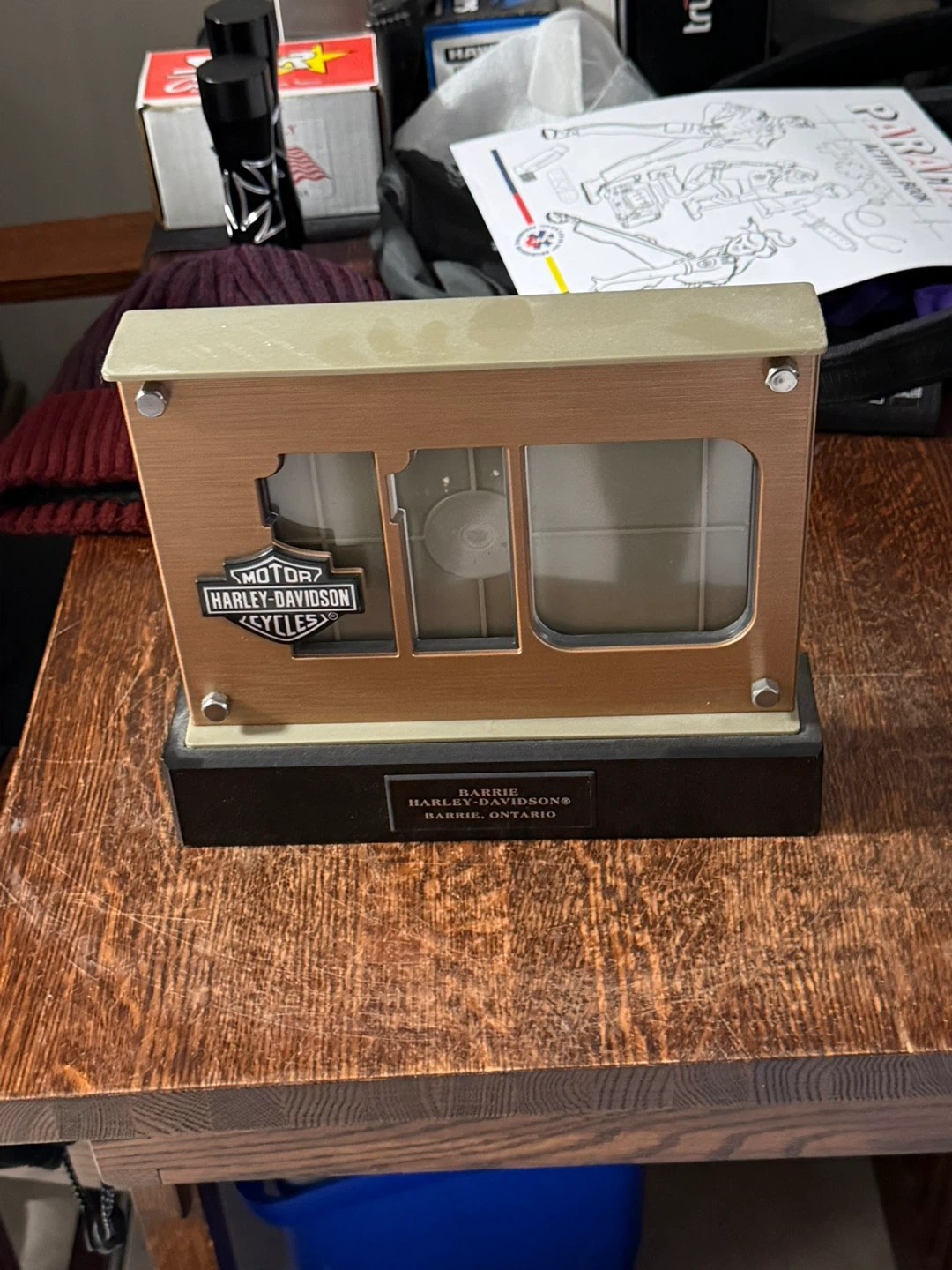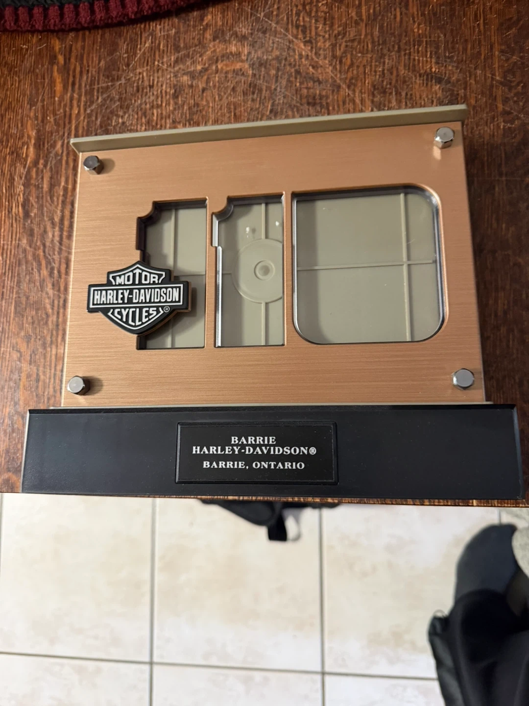 Harley-Davidson photo display frame from Barrie, Ontario. It has a copper-tone finish and features the iconic Harley-Davidson Motorcycles logo. Displays multiple photos or memorabilia.
