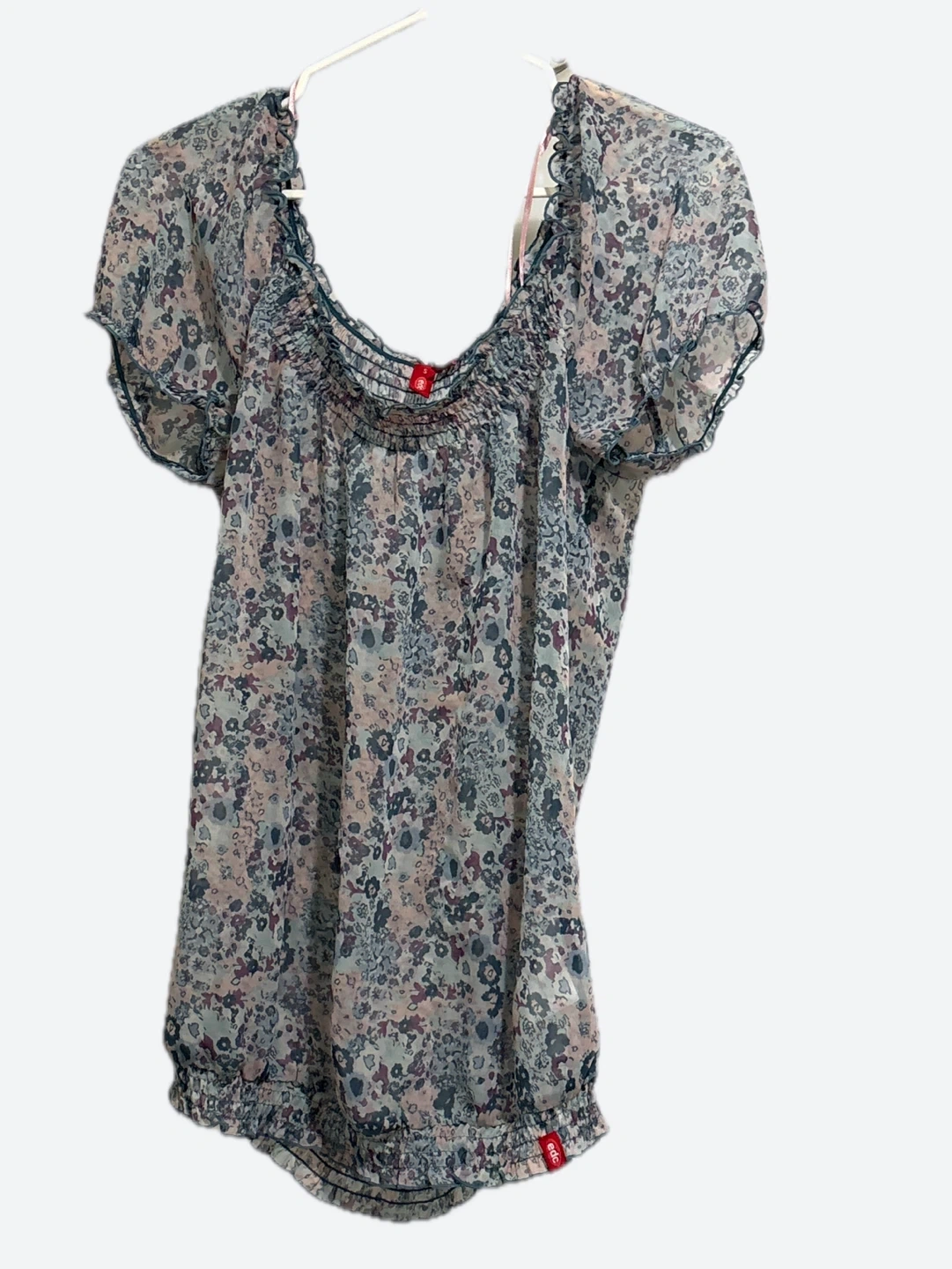 Lightweight off-the-shoulder blouse with a busy floral print. It has a smocked neckline and elasticated cuffs. Material is a sheer polyester.
