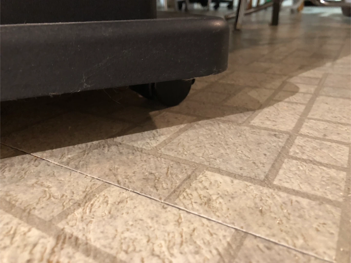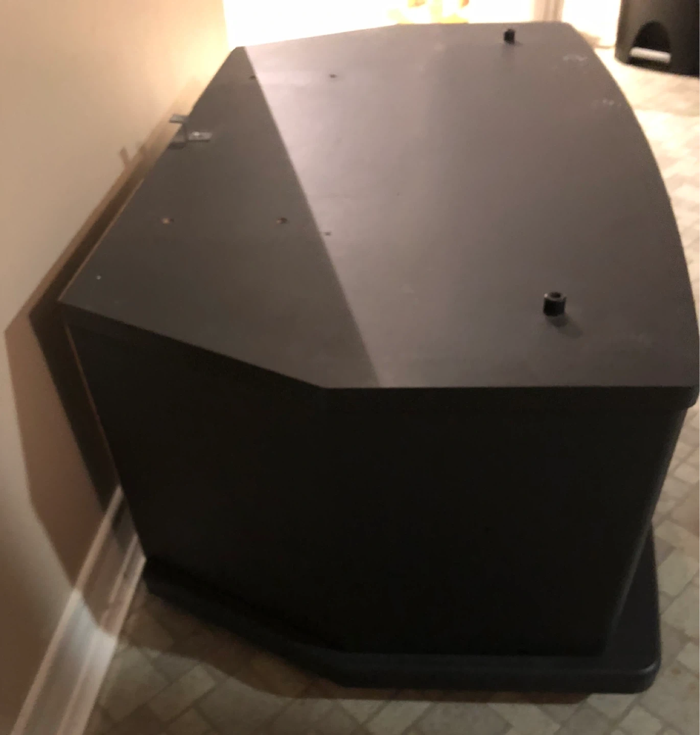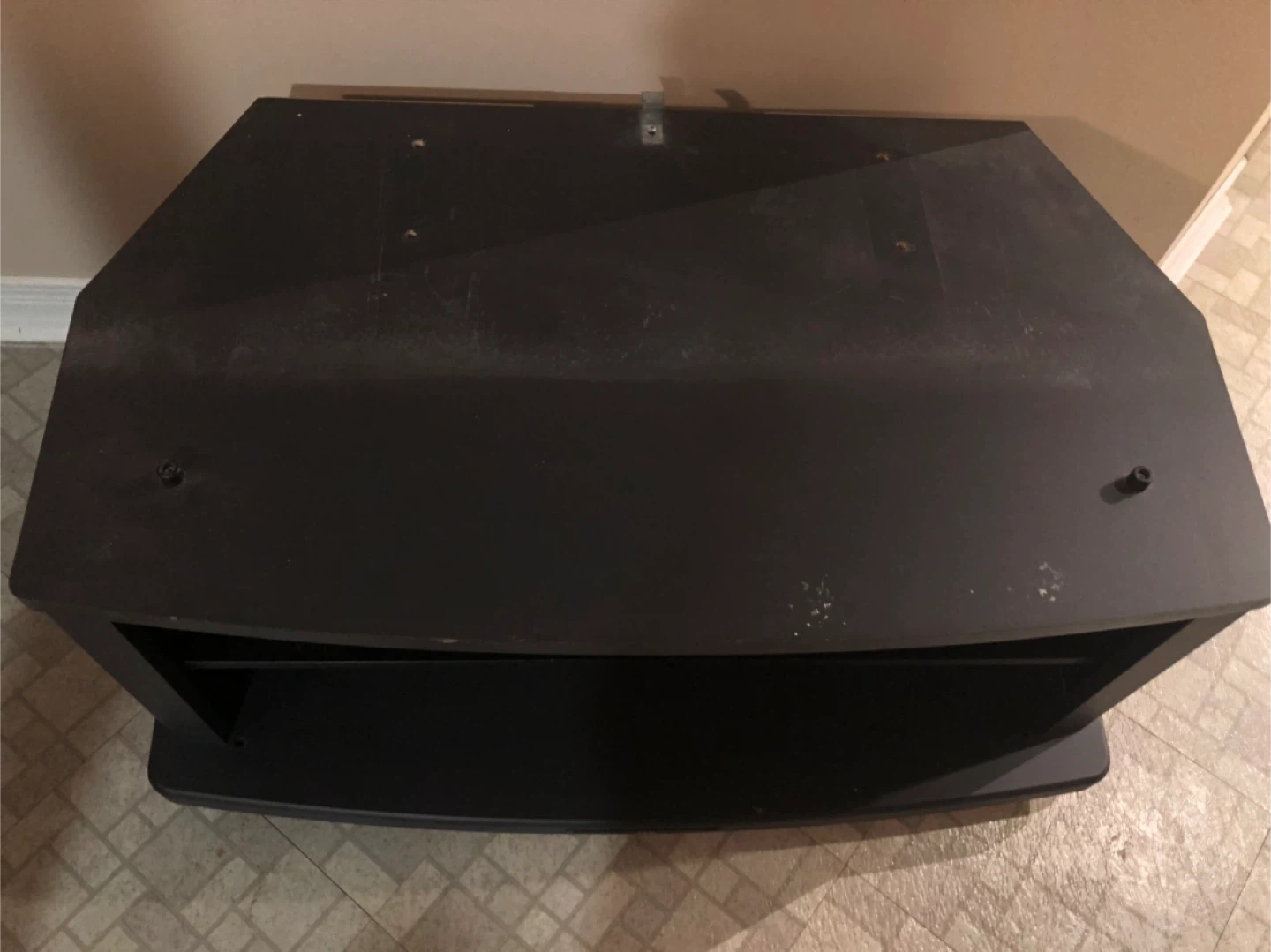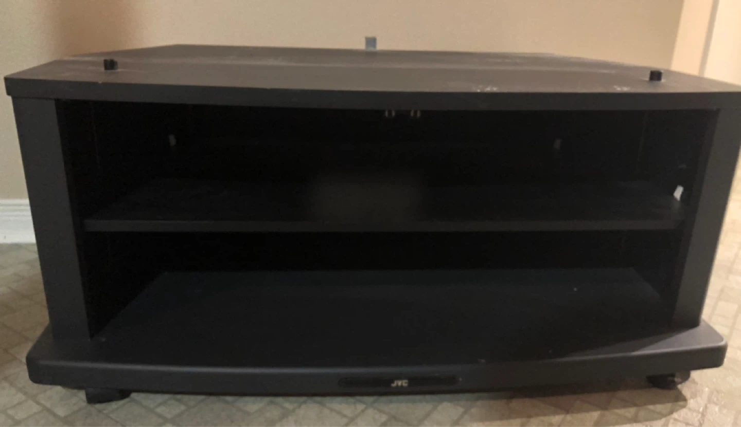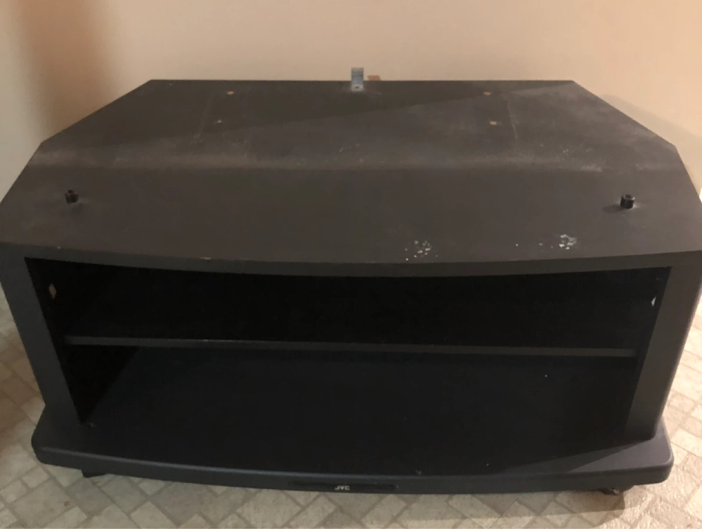 JVC TV stand in black. It has some signs of use, but is still in good condition. It has wheels for easy moving and two shelves for storage