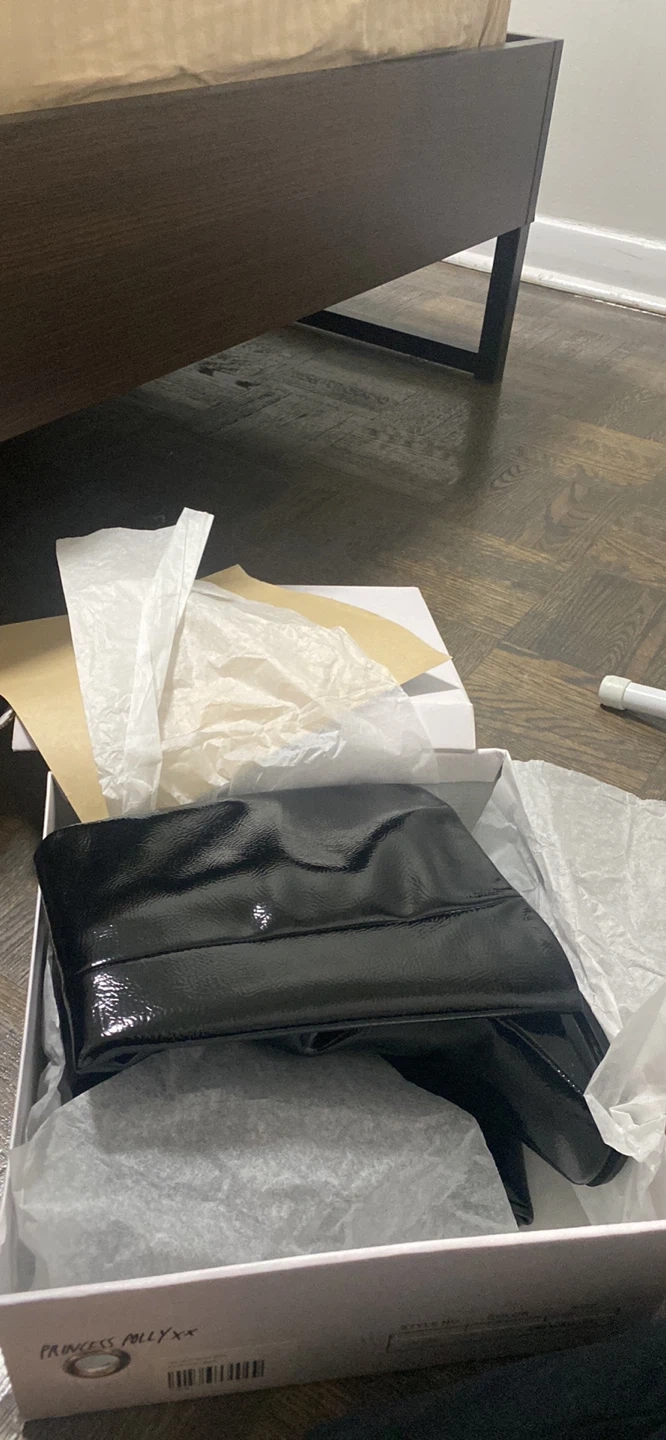 Princess Polly Lenore boots in black crinkle patent! They're a US size 8, EUR 39, and UK 6. Comes with the original box!
