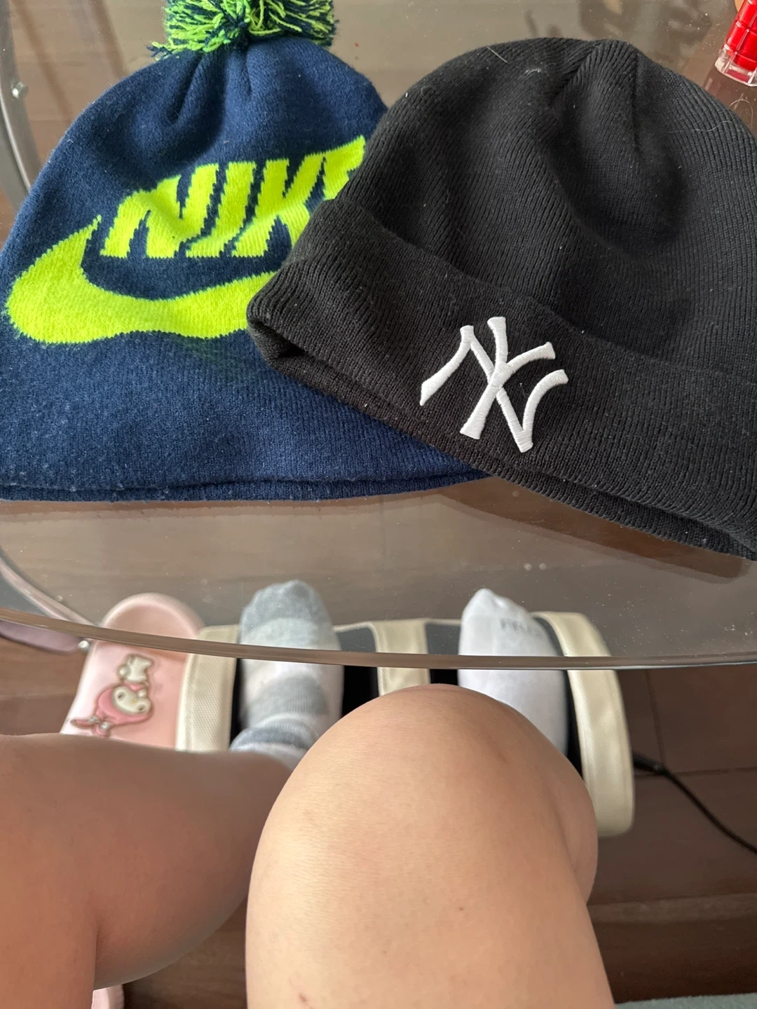 Two knit beanies, one Nike in navy with a neon green logo and pom, and one black New York Yankees beanie with a white logo. Cozy and stylish winter headwear.