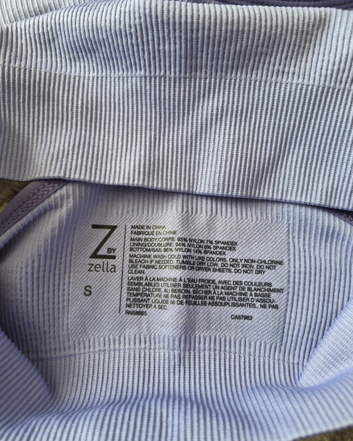 This Zella sports bra is made from a blend of nylon and spandex. It features a ribbed texture and a racerback design.