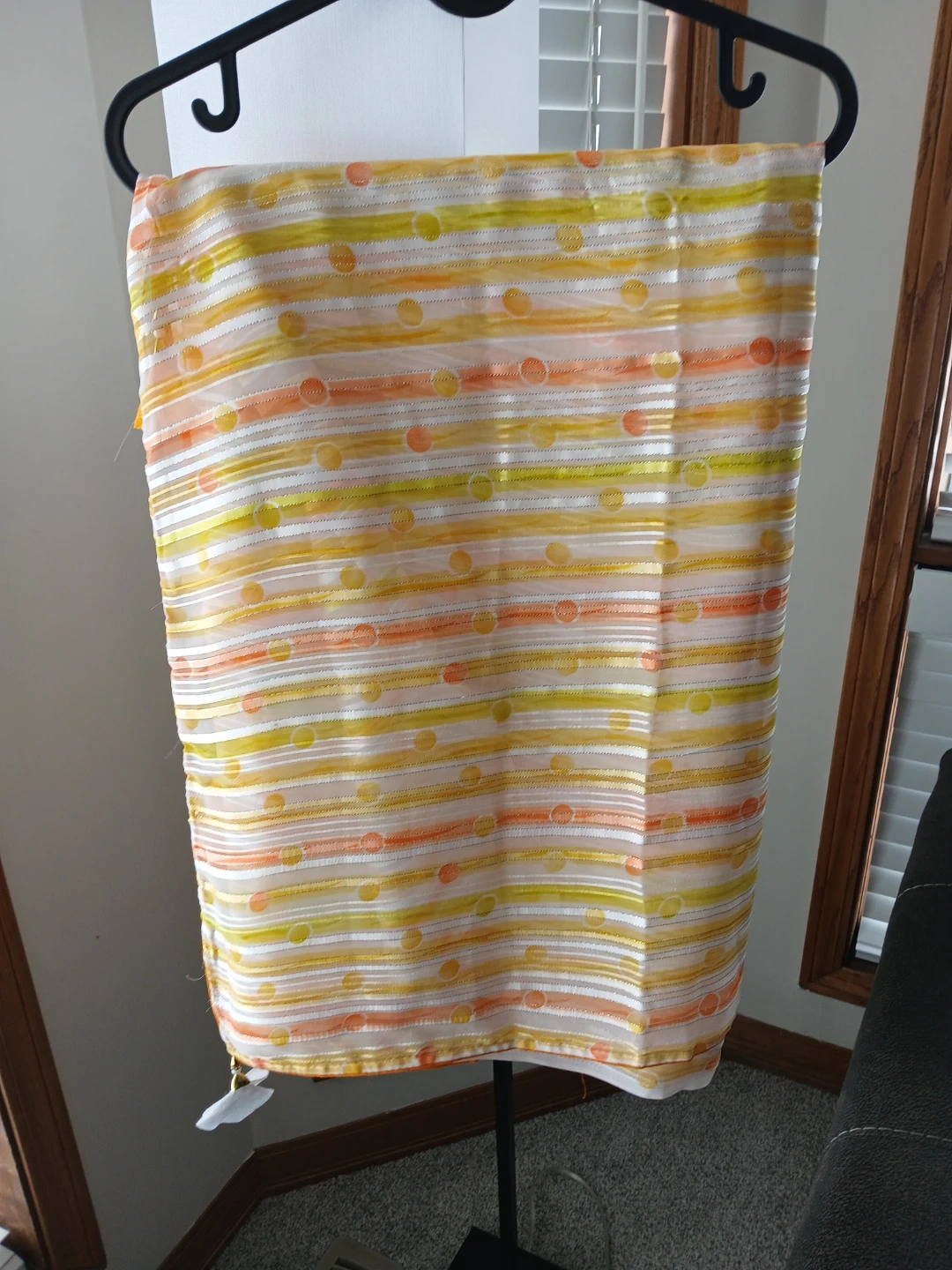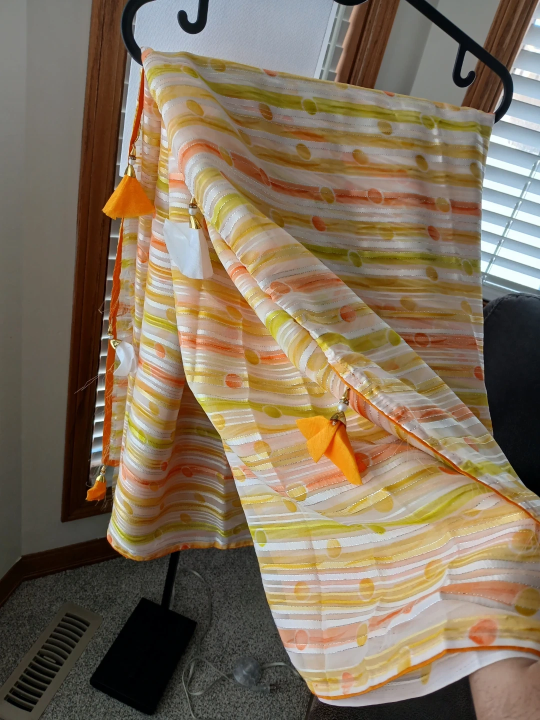 Lightweight Saree featuring a vibrant striped and polka dot pattern. Finished with decorative orange tassels on the ends. Perfect for adding a pop of colour to any outfit!