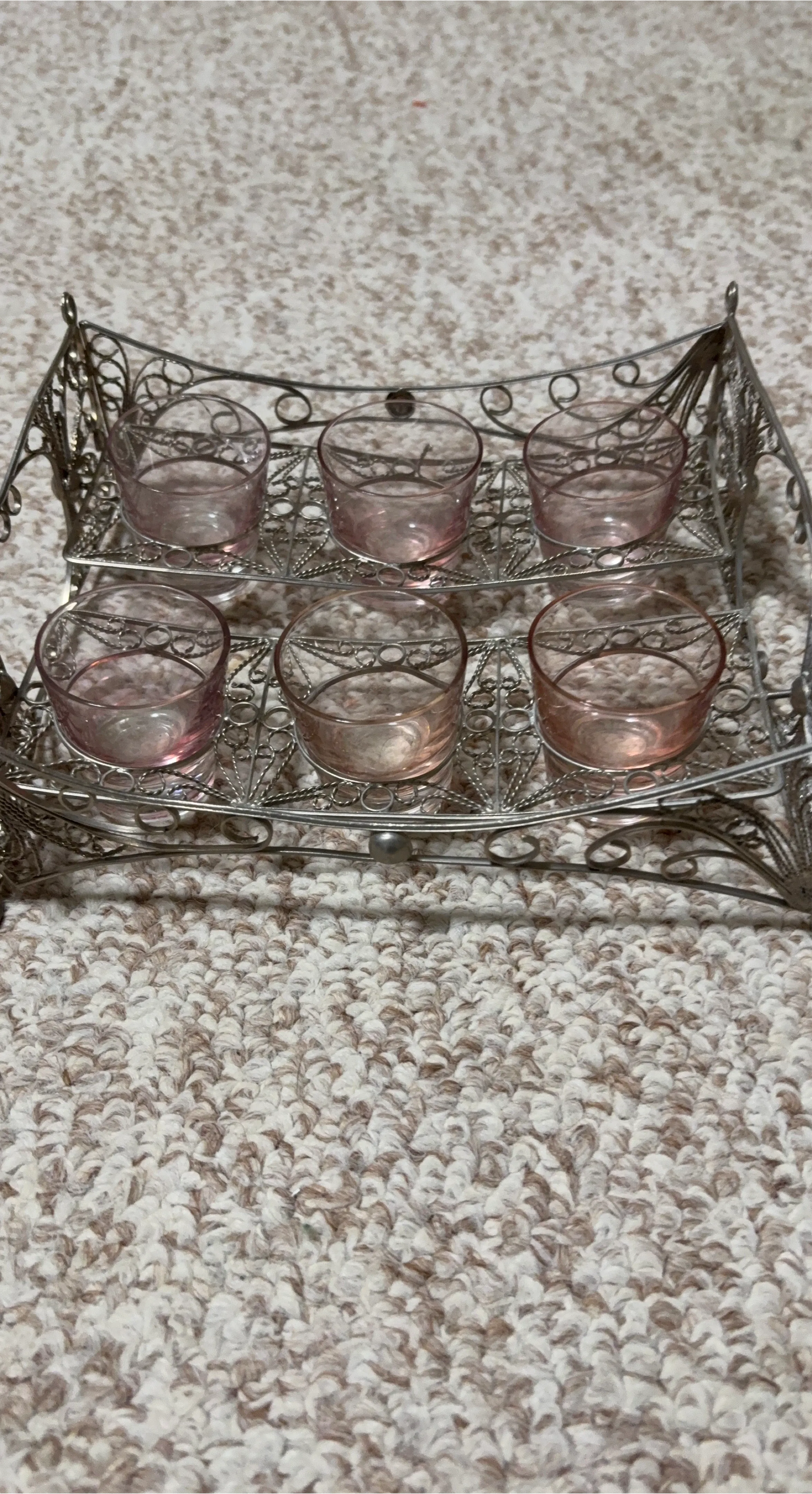 This set includes six small pink glass shot glasses in a decorative silver-tone metal holder. They're perfect for serving small drinks or as candle holders. The ornate metal stand adds a touch of vintage elegance.