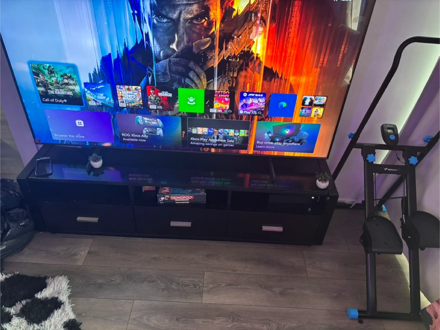 15Everything goes Queen size bed comes with 2 nightstand. 75” Samsung Qled TV(plastic covering still on screen. Full coverage warranty for another 2 years expires 2027. Will transfer to new owner. Also comes with entertainment system. XBOX 1X TB with controller and controller charging station. I could also toss in two professional mics and lighting. 1 Work station desk with 2 monitors and 2 chairs. Couch(black sectional) Total value is approximately $10,000. We are moving and looking to get rid of everything as a combo deal. No reasonable offer will be declined.