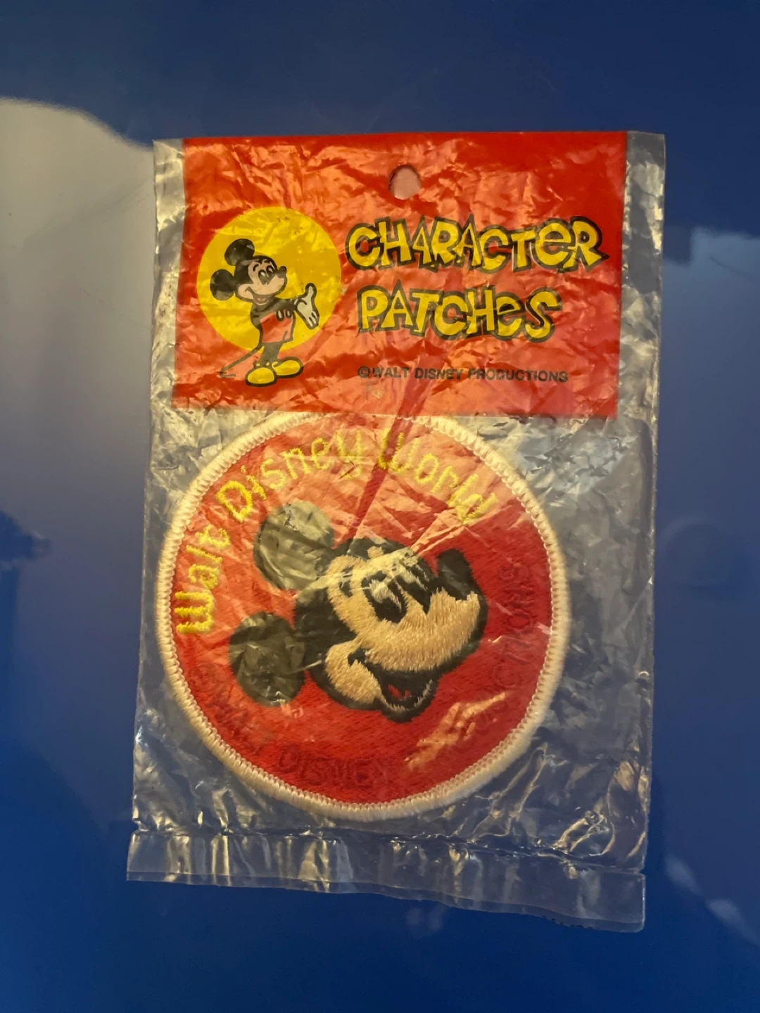 The item pictured is a vintage Walt Disney World character patch featuring Mickey Mouse in its original, sealed packaging. These patches were sold as souvenirs in the 1970s and 1980s.