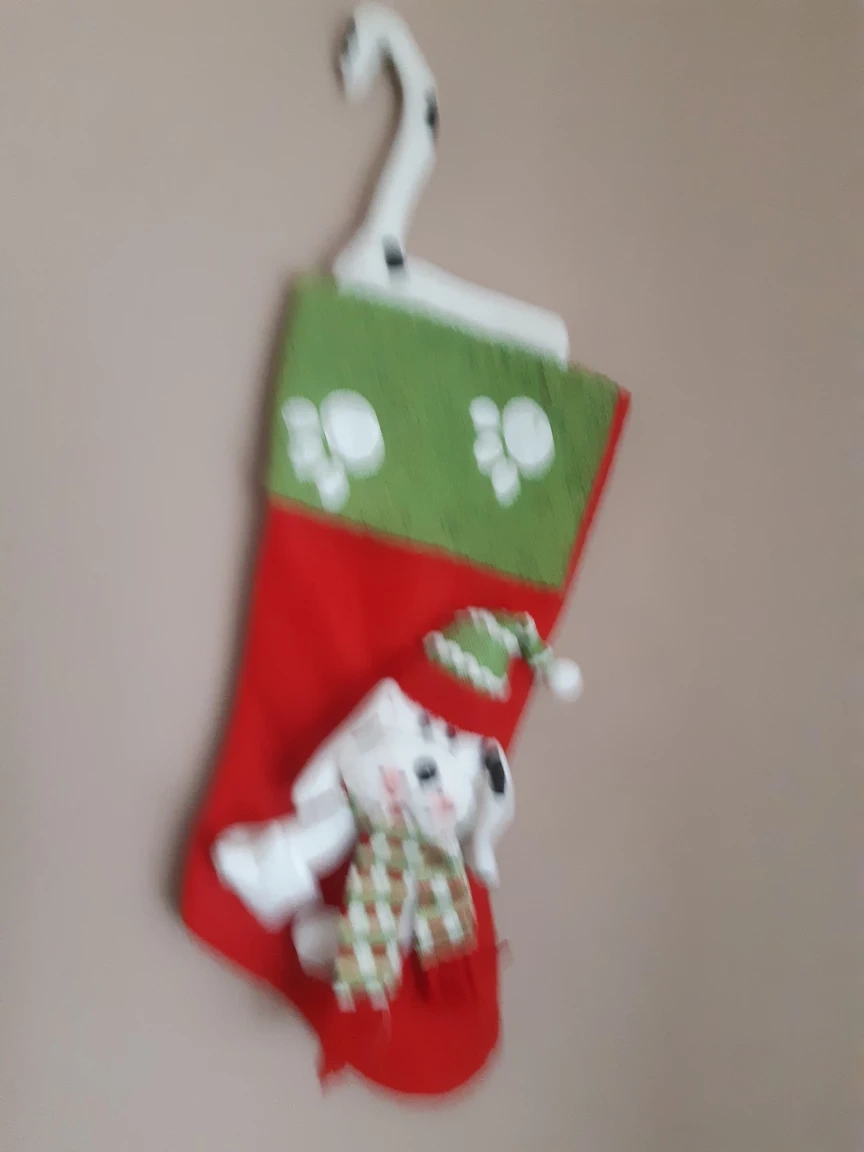 Festive Christmas stocking featuring a cute plush dog wearing a scarf and hat! The stocking is red and green with adorable paw print details. Perfect for adding some holiday cheer to your home!