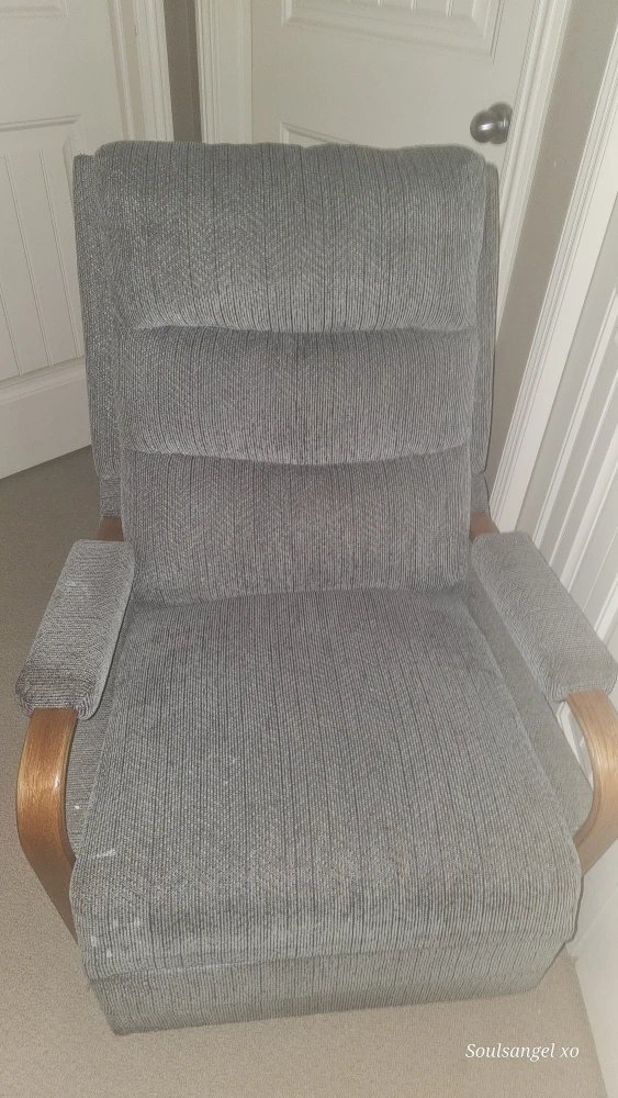 Selling a cozy armchair with a grey upholstered finish and wooden armrests. It's in gently used condition, perfect for adding a touch of comfort to any room in your home